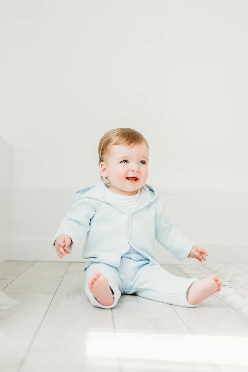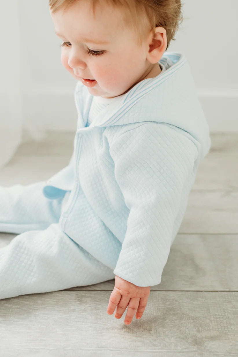 Our Benjamin blue quilted set features our luxurious quilted pima pant, jacket, and pima cotton blue and white stripe onesie. This outfit will be a staple in baby boys closet. Fit is tts.
