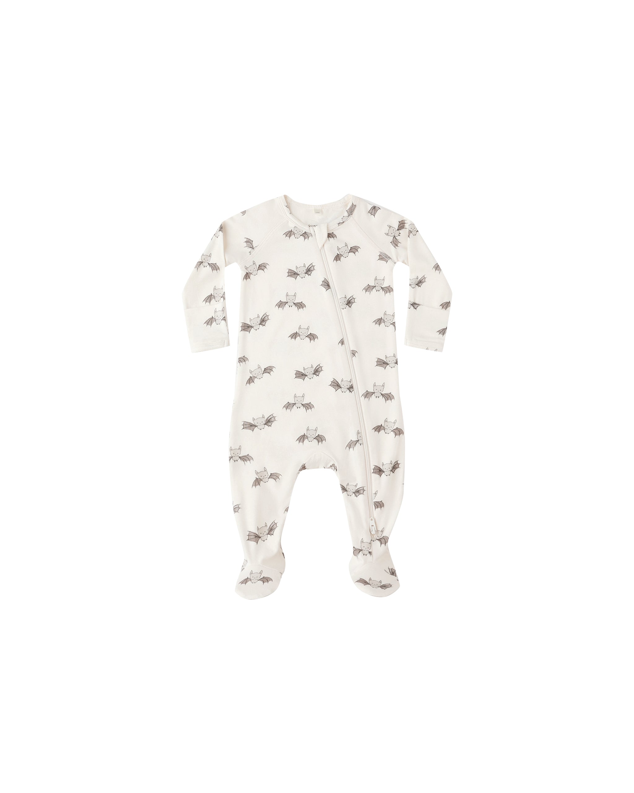 Full double-zip footie crafted from our soft and stretchy bamboo fabric. Fold-over hand mitts included on sizes NB – 3-6M. Raised screen print on soles of size 6-12M for added traction.