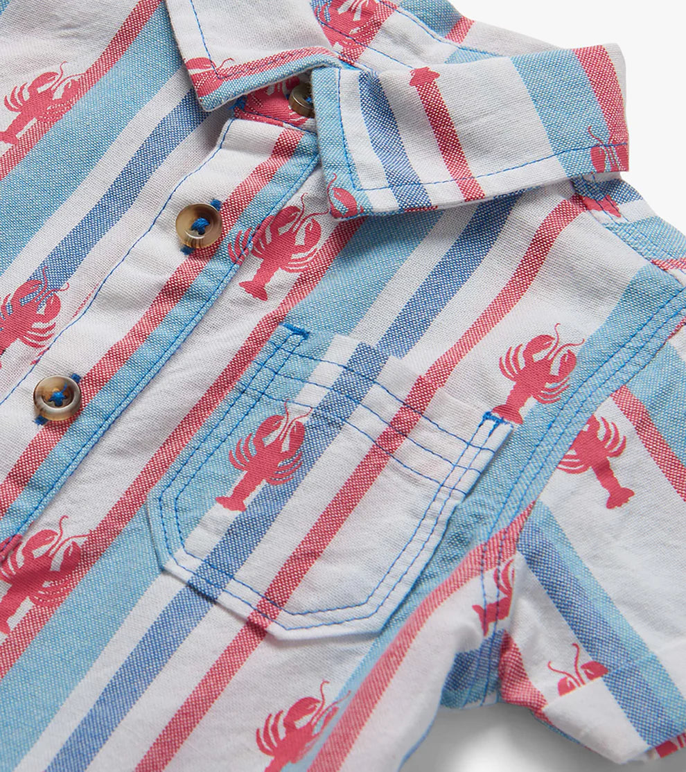 This charming romper features an all-over salmon pink lobster print set against a crisp white background, accented by vertical stripes in salmon pink and shades of blue for a classic coastal look. Designed with short sleeves for warm-weather comfort, it showcases a timeless dress shirt–style collar and contrast buttons along the chest up to the neckline for a polished, preppy finish. A front left chest pocket adds a touch of casual charm and functionality. Crafted from soft cotton, this romper keeps little ones comfortable during beach days, summer outings, and everything in between.