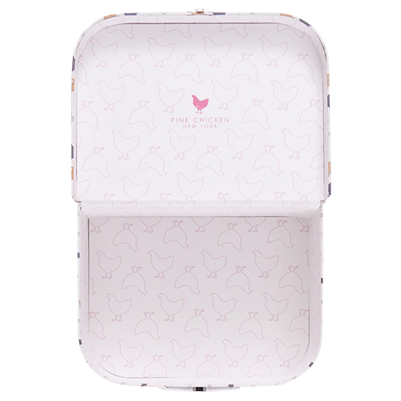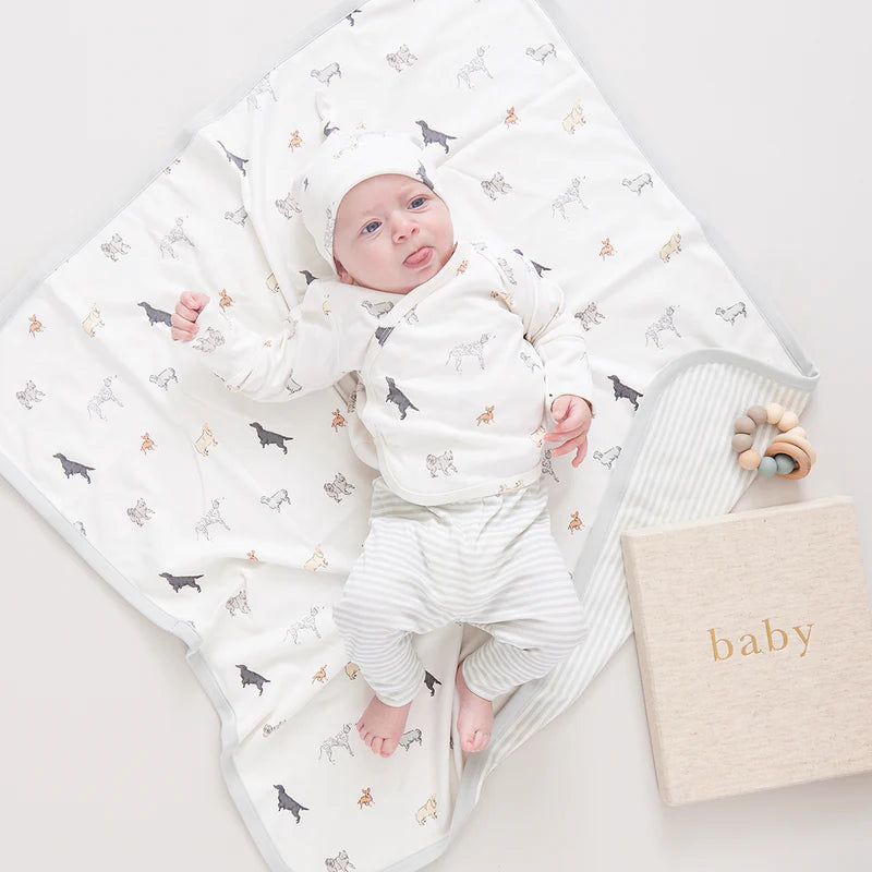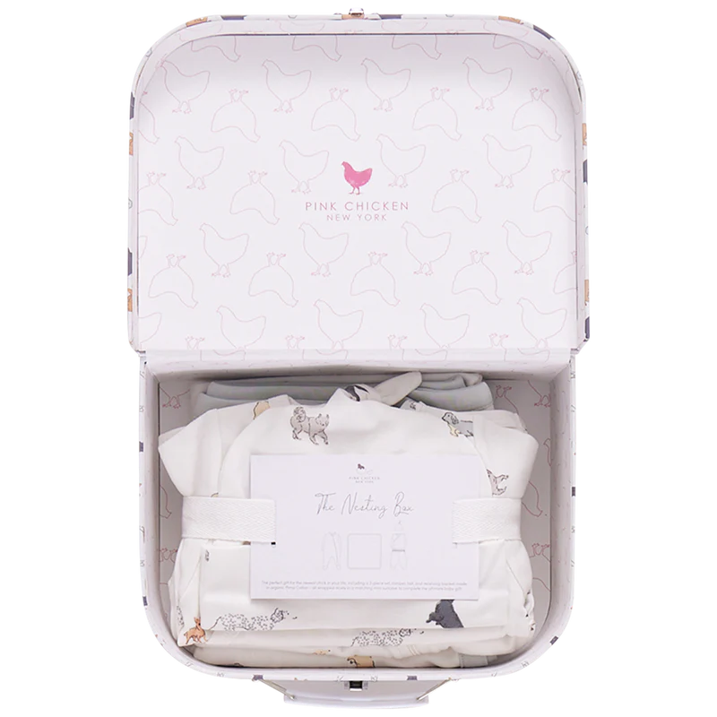 New Print for Nesting Box! Spoil the newest chicks in your flock by feathering their nest with our classic Baby Organic Pima Cotton take home set in Tiny Dogs. Inside an adorable printed mini-suitcase rests a complete collection of newborn necessities in classic Pink Chicken prints and patterns. Box includes: one printed wrap top with fold-over mittens, one elastic waist solid pant, one printed knotted hat, one long sleeve zipper footie with fold-over mittens and zipper protector and one printed take home blanket with contrasting print on reverse side. It's the perfect newborn gift set for your work bestie, favorite cousin, roommate from college or any new mom in your life.