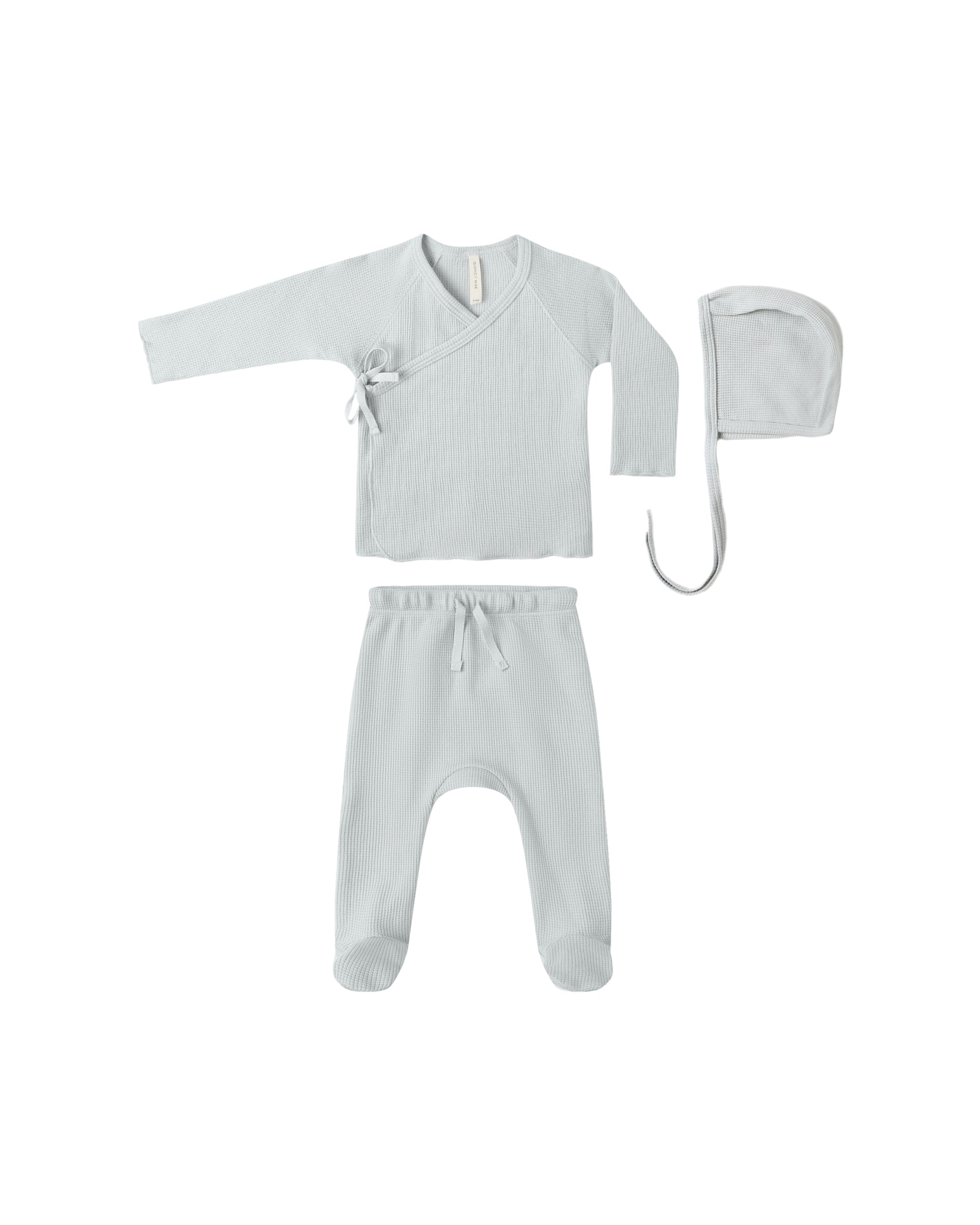 Our Take Home Set in soft, lightweight waffle fabric is the perfect outfit for welcoming your newborn. This sweet set includes a bonnet, a wrap snap and tie top, and footed drawstring pants.