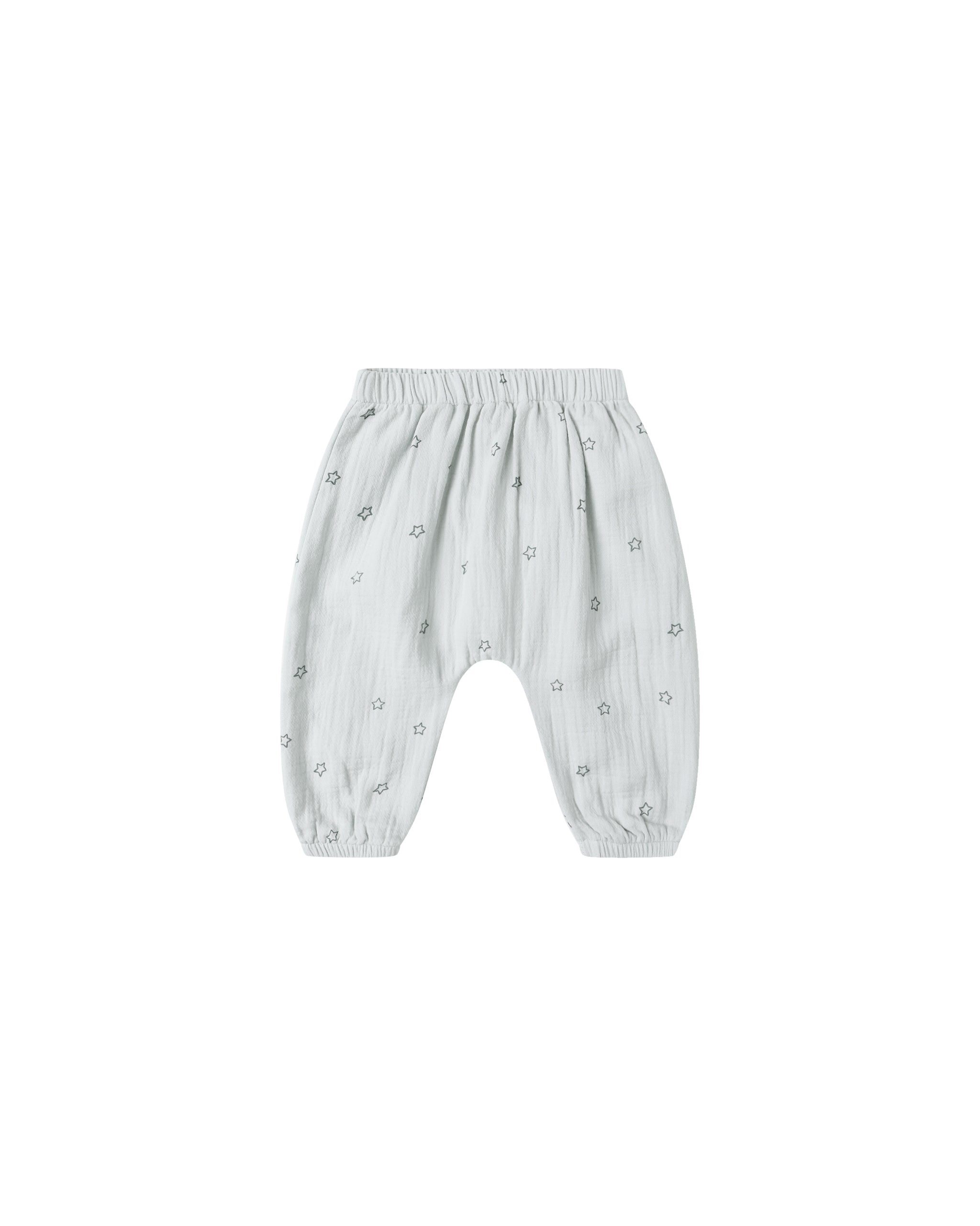 Woven pants with an elastic waistband and leg openings, designed with a dropped crotch for a relaxed, easy fit.
