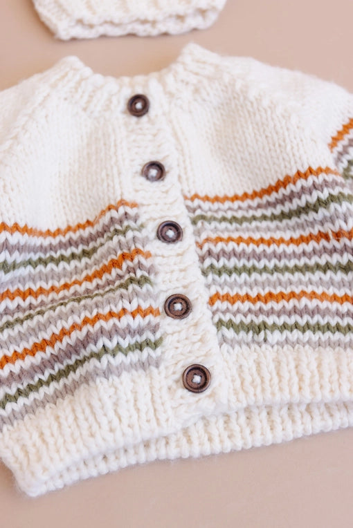 Featuring a gentle base, this Cardigan's welcoming tiny hearts will have your little one feeling like they're wrapped in your love. The Retro colorway includes our Cinnamon, Mustard, Olive, and Navy colors. Hand wash and lay flat to dry.