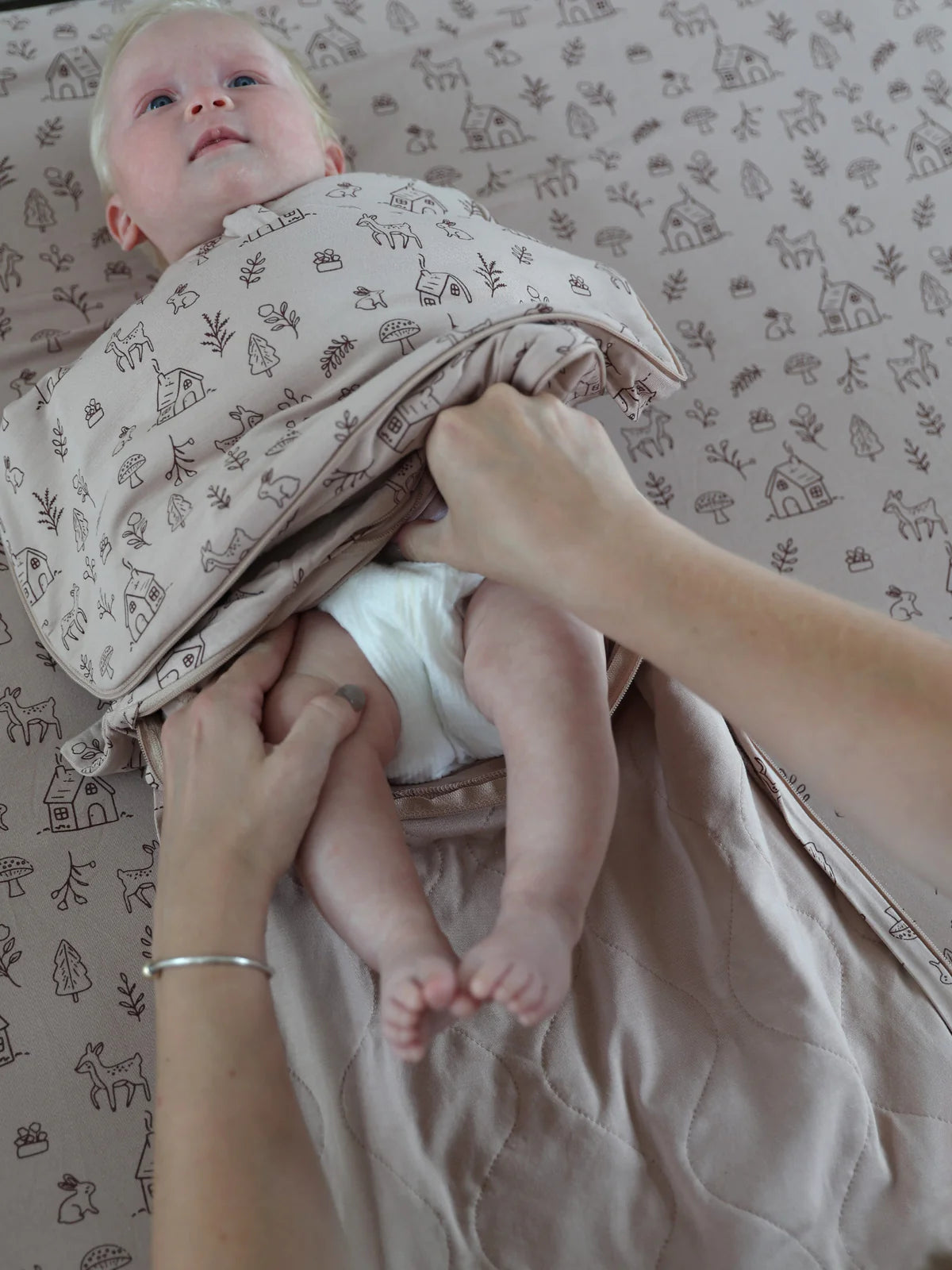 The other parents will be jealous of your sleep. Wrap your little bug up in the sleep bag swaddle that keeps them swaddled during diaper changes. Simply zip them up, arms in or out, with an optional built-in belly band. They’ll stay uber cozy + covered, surrounded by silky soft bamboo rayon and our easy-change WONDERZiP®.