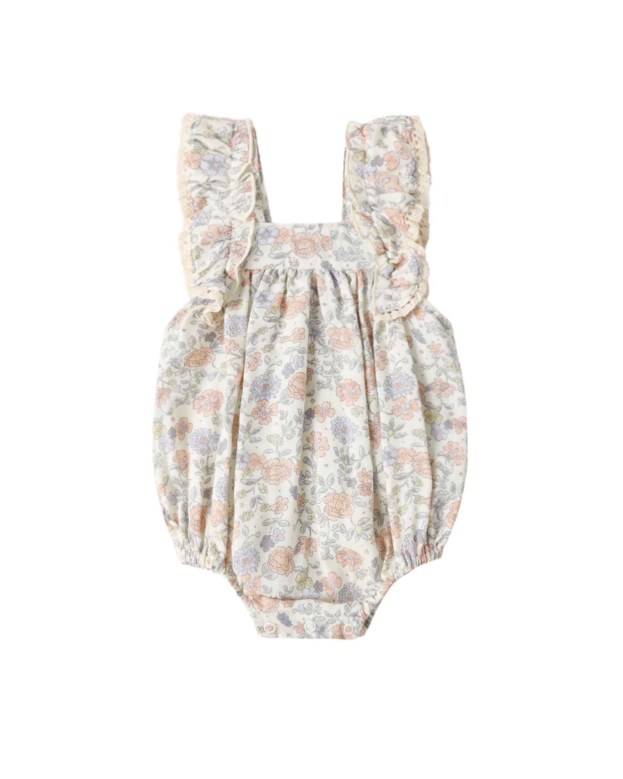 Our sweet Maya Romper features flutter straps and bottom snaps for an easy breezy look.