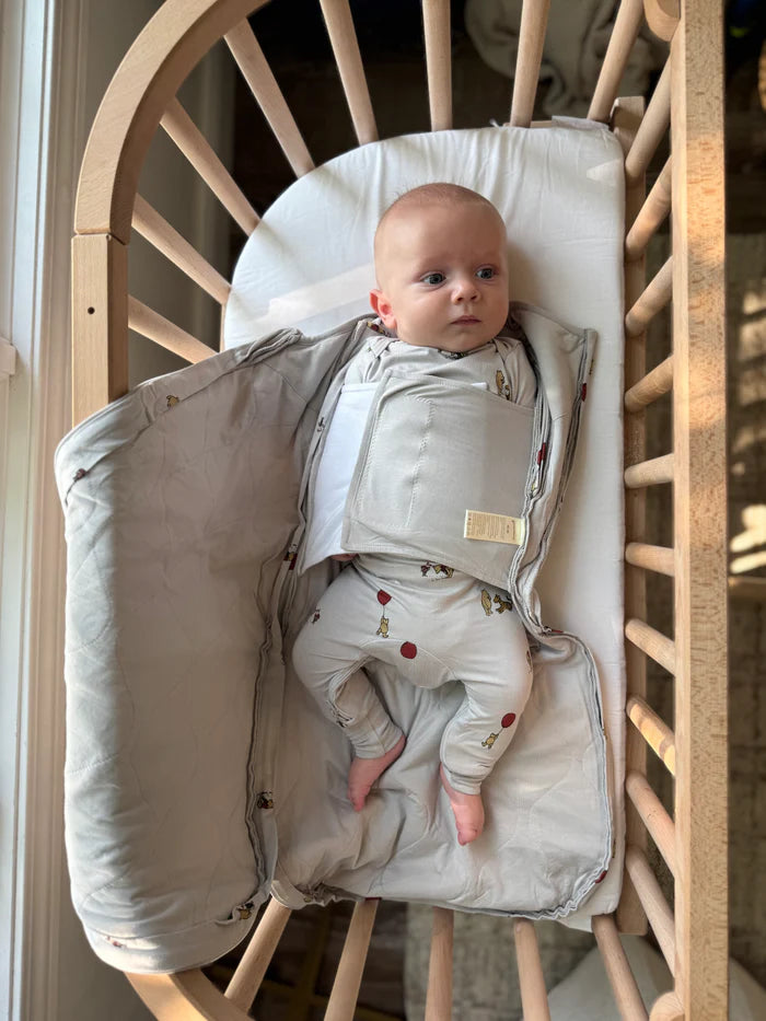 The other parents will be jealous of your sleep. Wrap your little bug up in the sleep bag swaddle that keeps them swaddled during diaper changes. Simply zip them up, arms in or out, with an optional built-in belly band. They’ll stay uber cozy + covered, surrounded by silky soft bamboo rayon and our easy-change WONDERZiP®.
