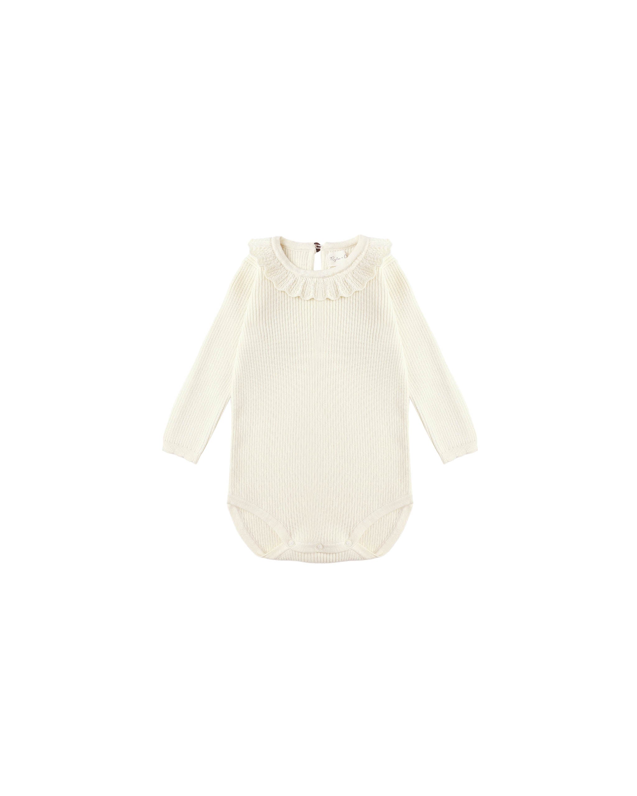 An essential for your little one, this darling knit bodysuit features a sweet ruffle collar, back keyhole button closure, and bottom snaps for effortless changes. Perfect for layering all season long.