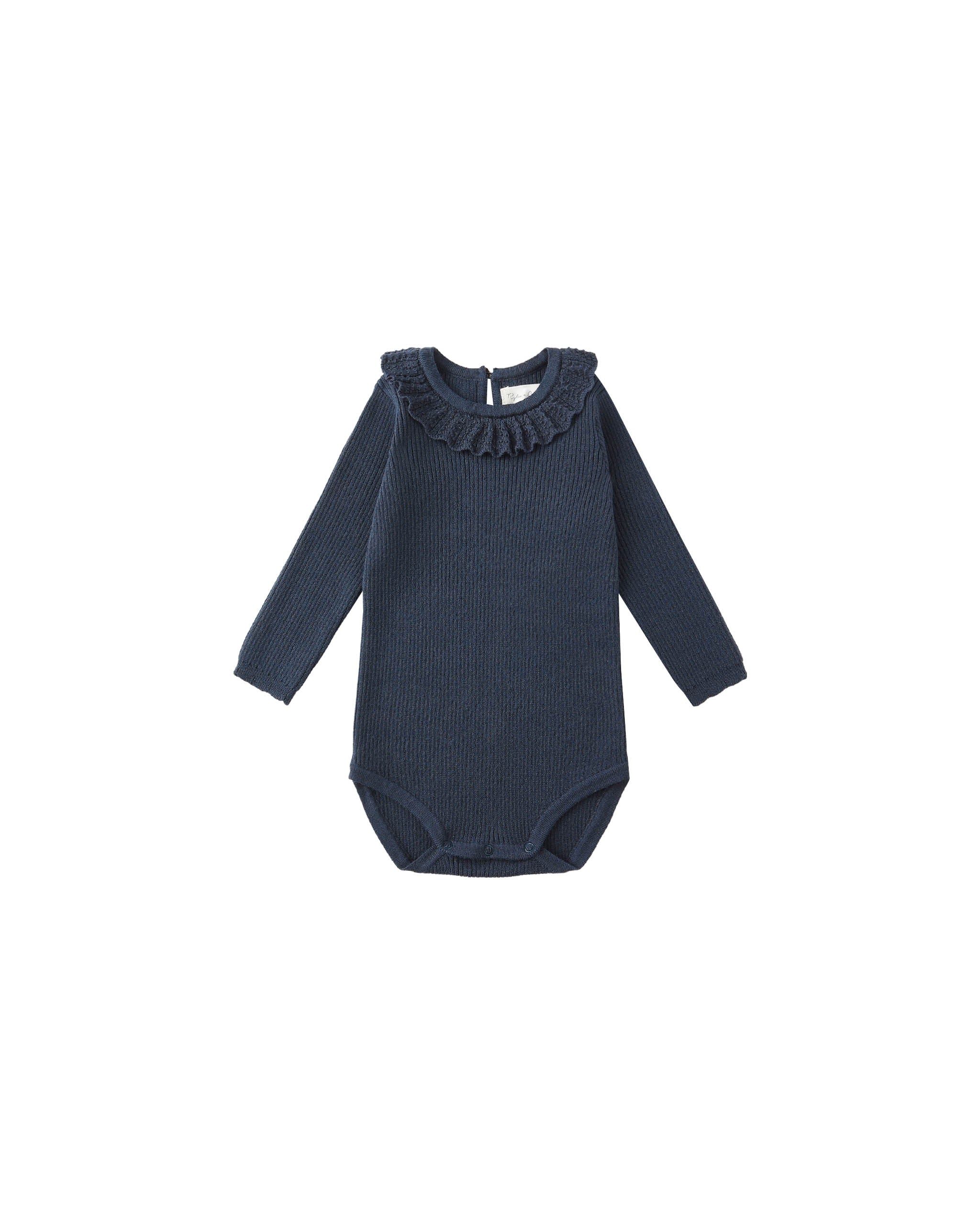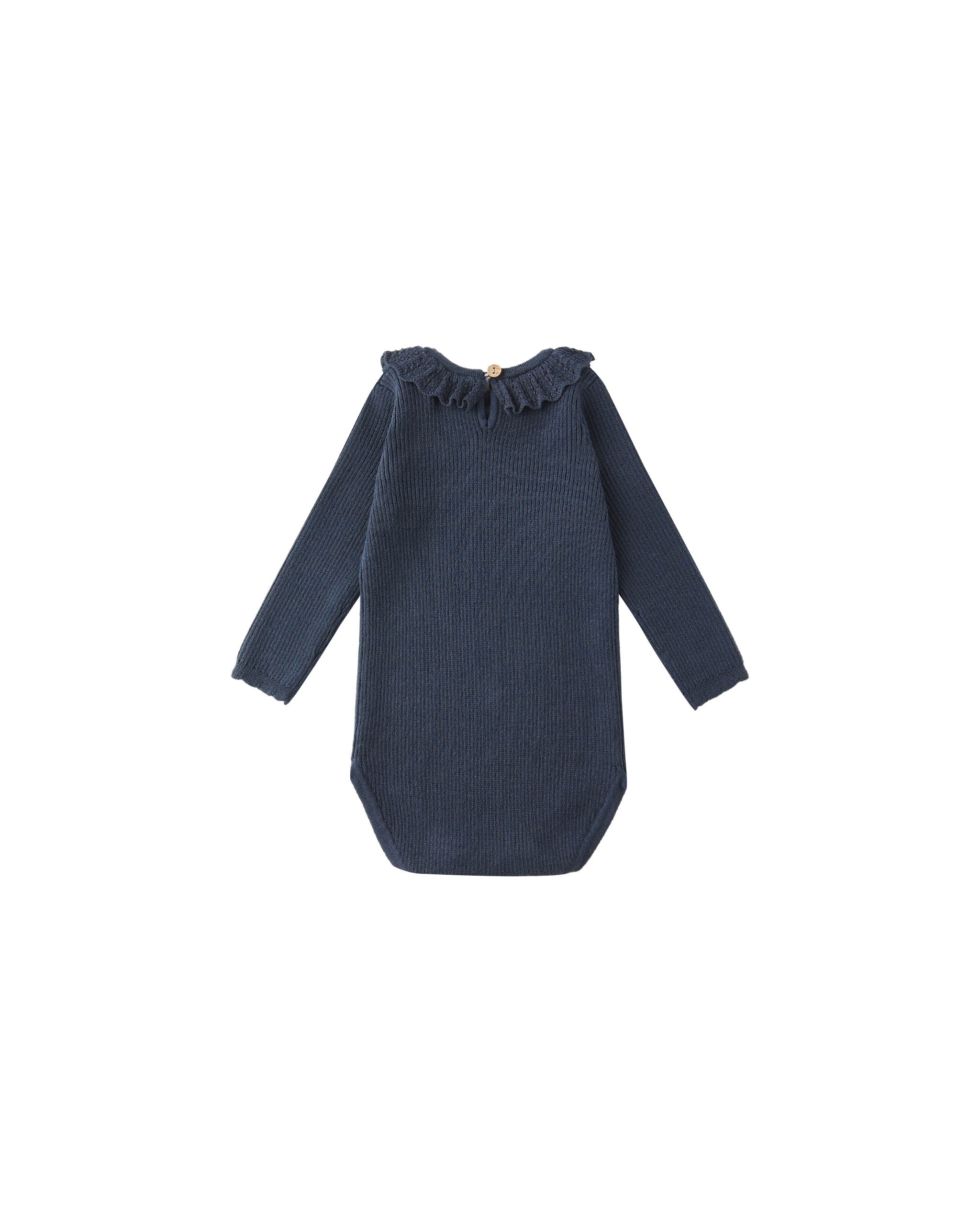 Rylee + Cru Ribbed Ruffle Collar Bodysuit in Navy