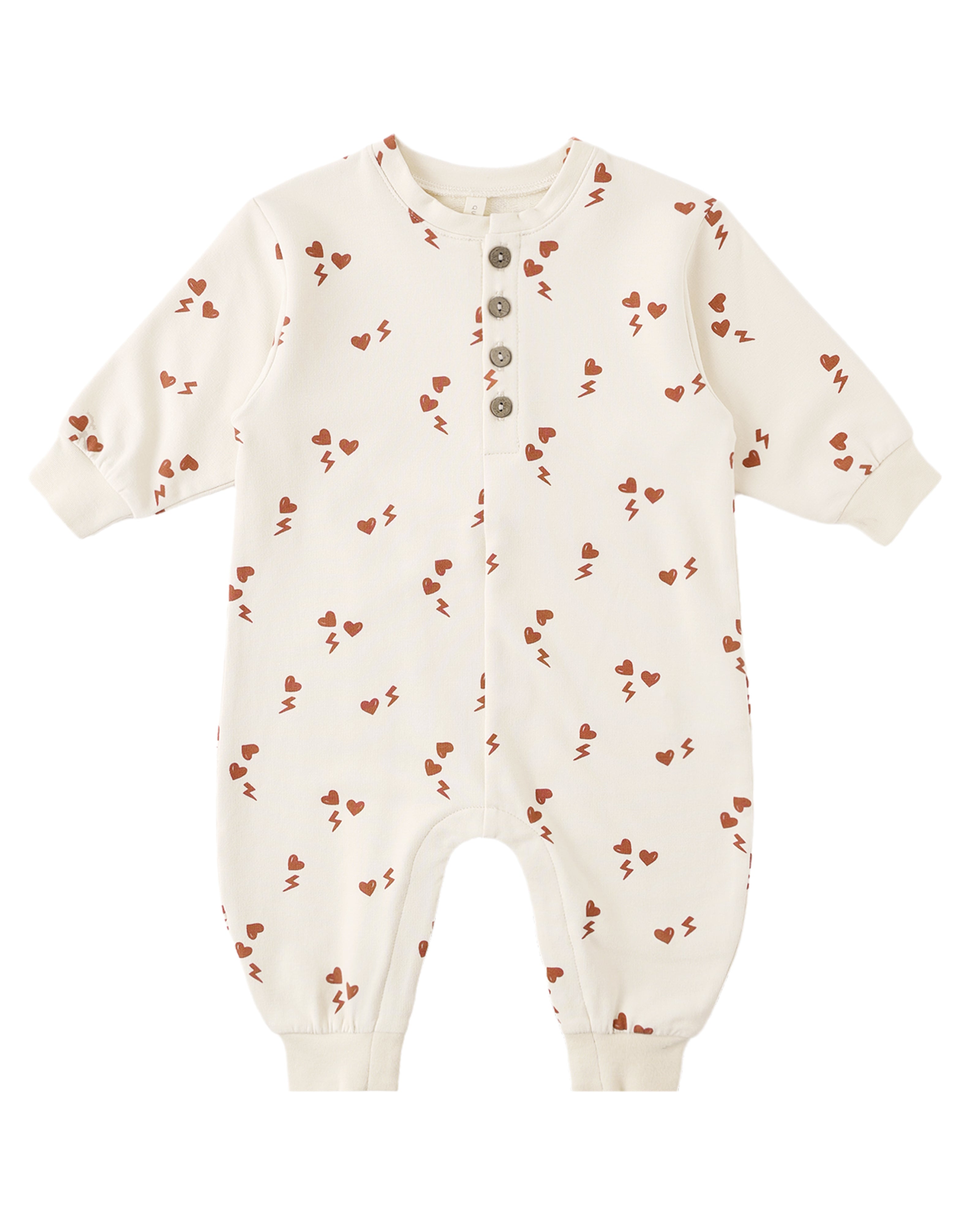 Our Relaxed Fleece Jumpsuit is a cozy and fun wardrobe staple. Designed with coconut buttons down the front and gathered wrists and ankles for a snug fit. Sizes 0-3m - 18-24m feature hidden snaps along the inseam for easy changes.