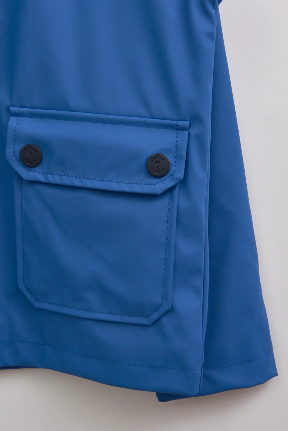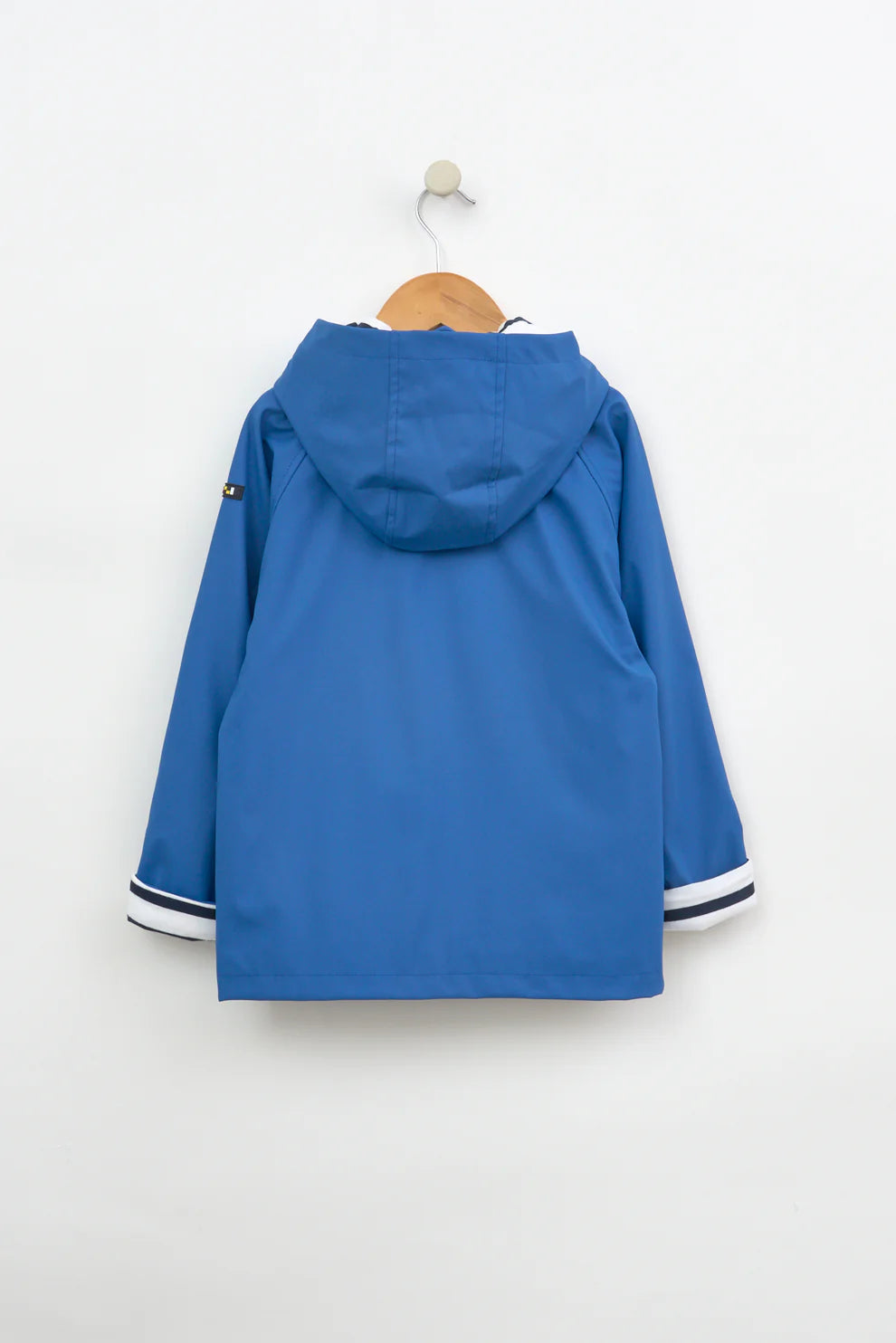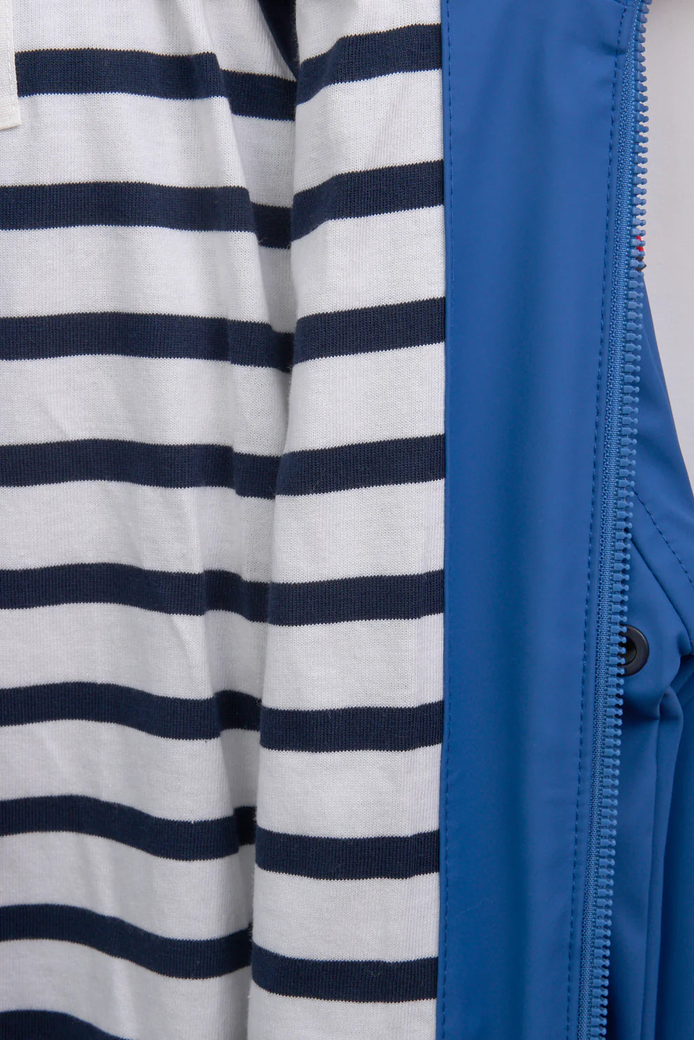 Boys' or girls' polyurethane nautical raincoat with a cotton lining on the sleeves, body, and hood, featuring a nautical stripe. A perfect style for a nautical look, with its flap pockets and anchor-printed snap buttons. It has raglan sleeves for optimal mobility.