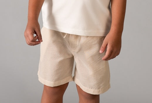 Mayoral Boys Striped Drawstring Shorts in Sand - is backordered and will ship as soon as it is back in stock.