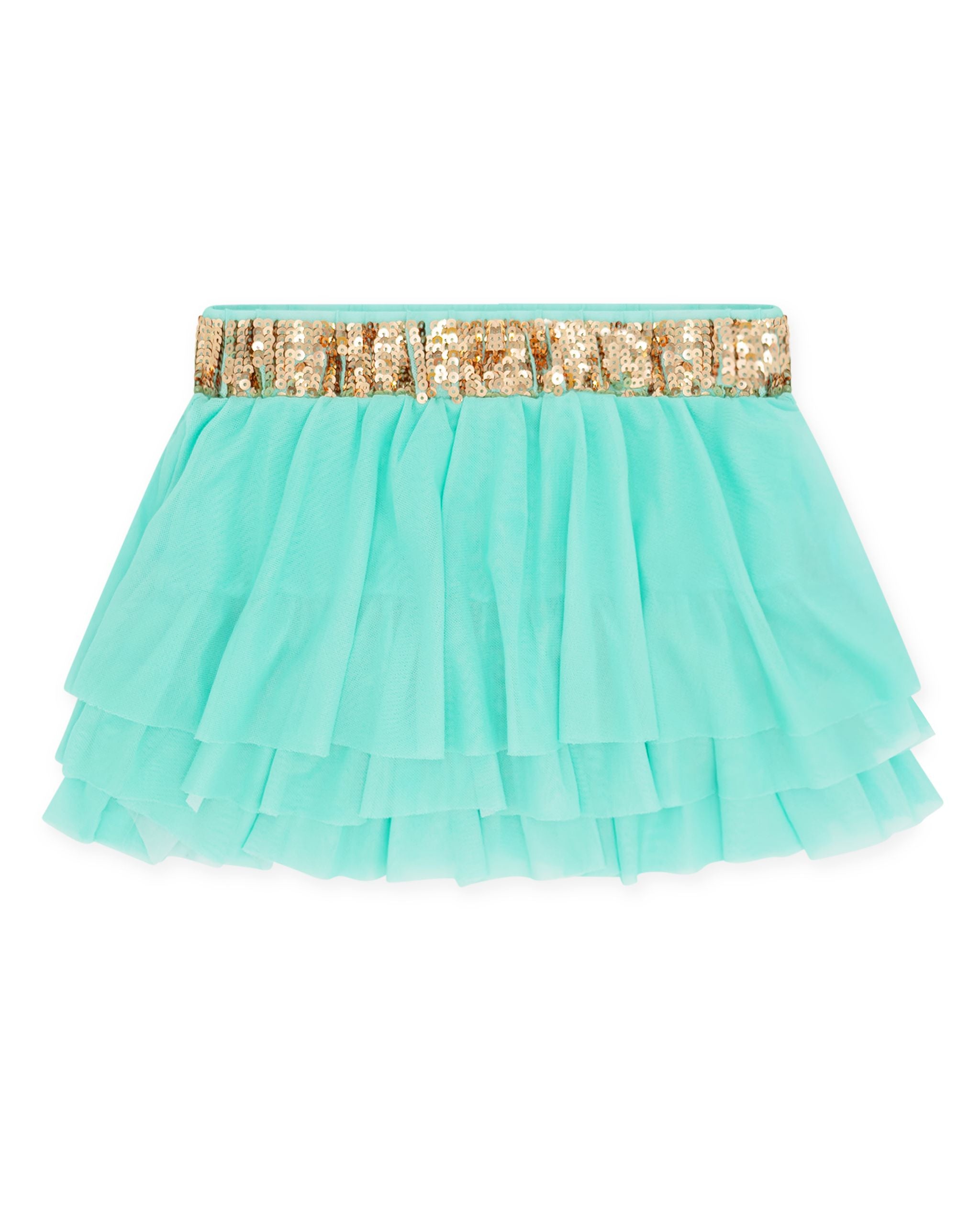 🌸 Design Detail – Complete mermaid vibes are just a skirt away! This cover-up skirt is made from a lightweight mesh fabric in our classic aqua crystal color, with a tiered ruffle and sparkling gold sequin elastic waistband for comfort and secure fit. Style on top of our "Sea Star Bikini" or any of our Mermaid inspired collection pieces.