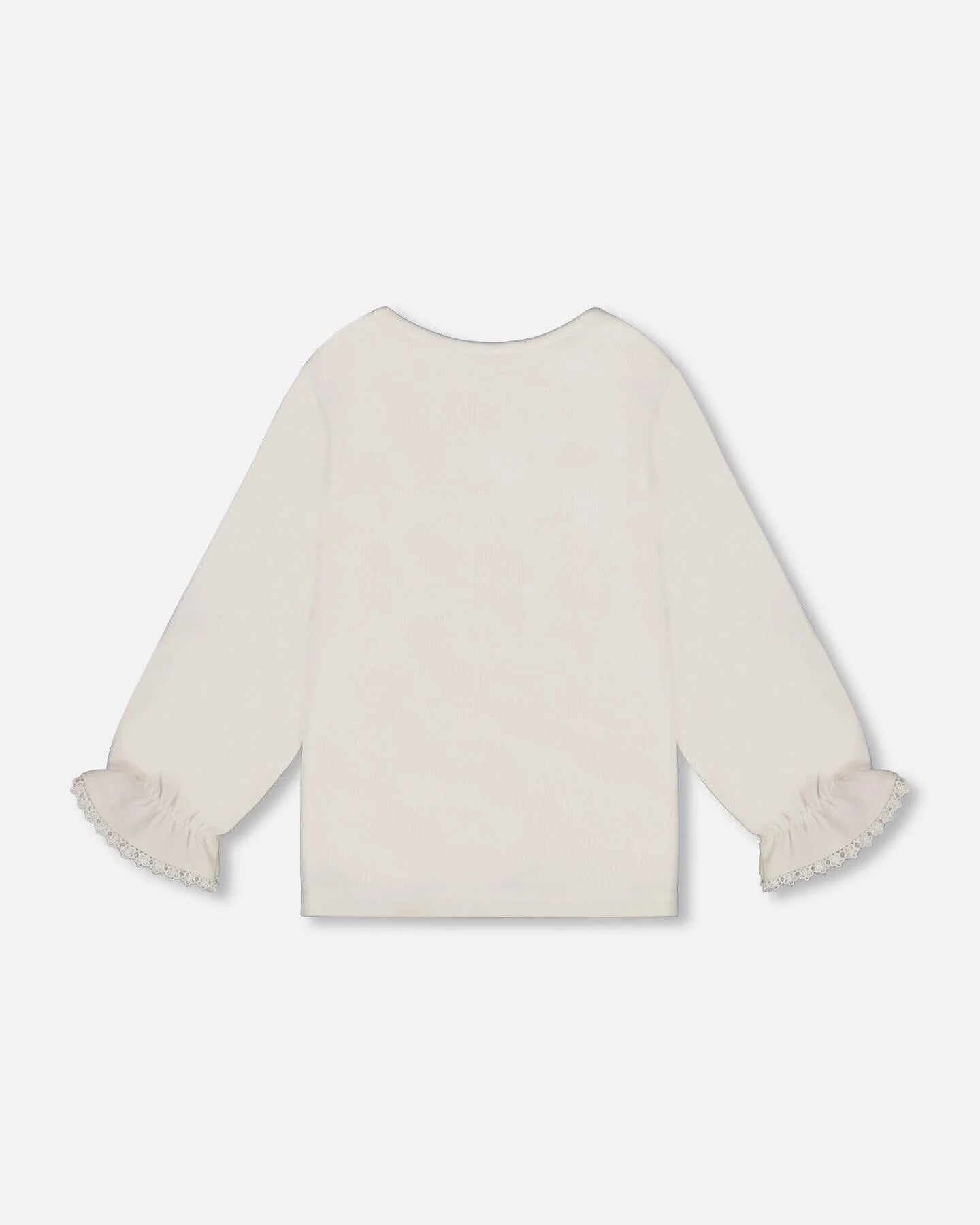 Deux Par Deux Jersey Top Off-White With Embroidered Floral Sleeves