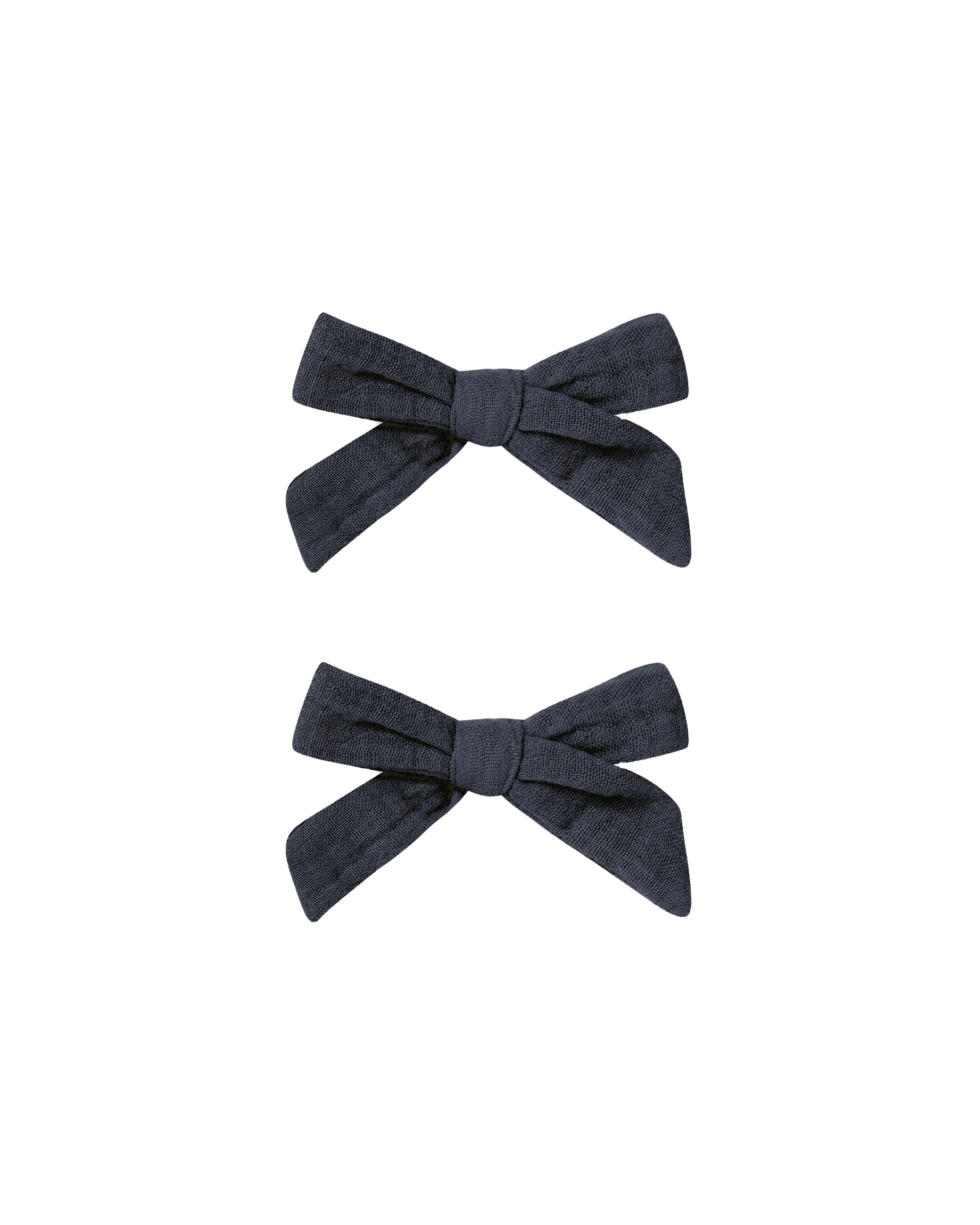 Set of 2 adorable bow clips—perfect for adding a sweet finishing touch to her look.Featuring our ‘navy’ hue. Approximate width ~3.5"Made of 100% cotton.