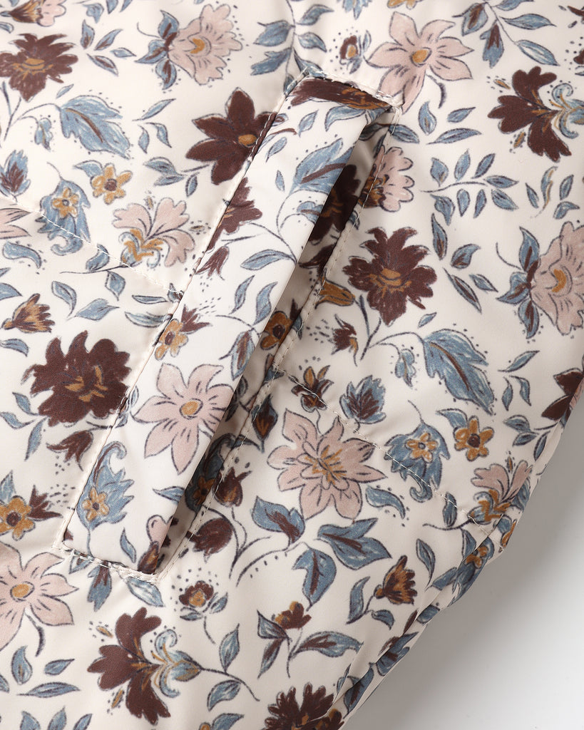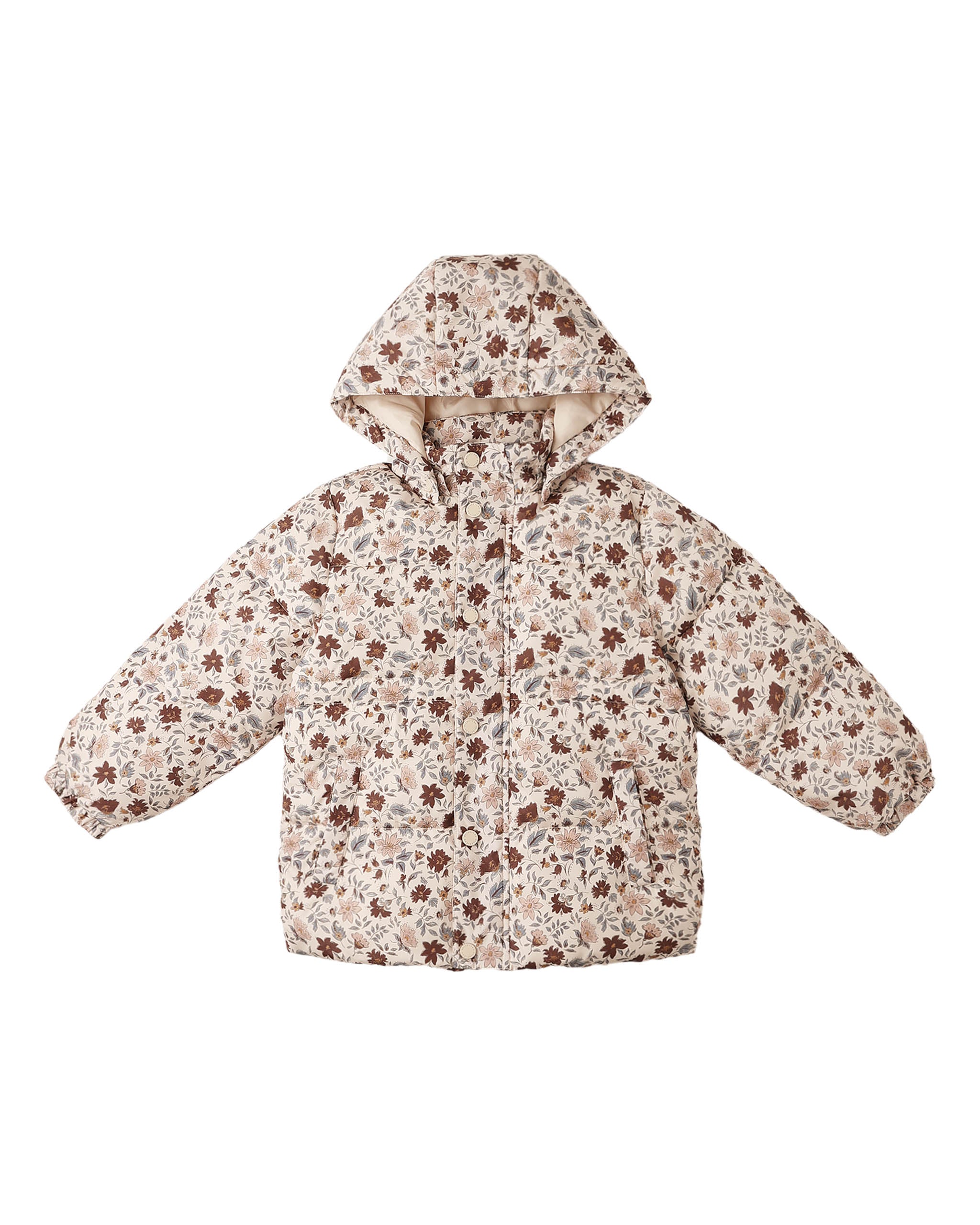 Our Puffer Jacket keeps your little one warm and ready for every winter adventure. Featuring down filling, a cozy hood, a hidden front zipper with snap closures, and warm pockets.