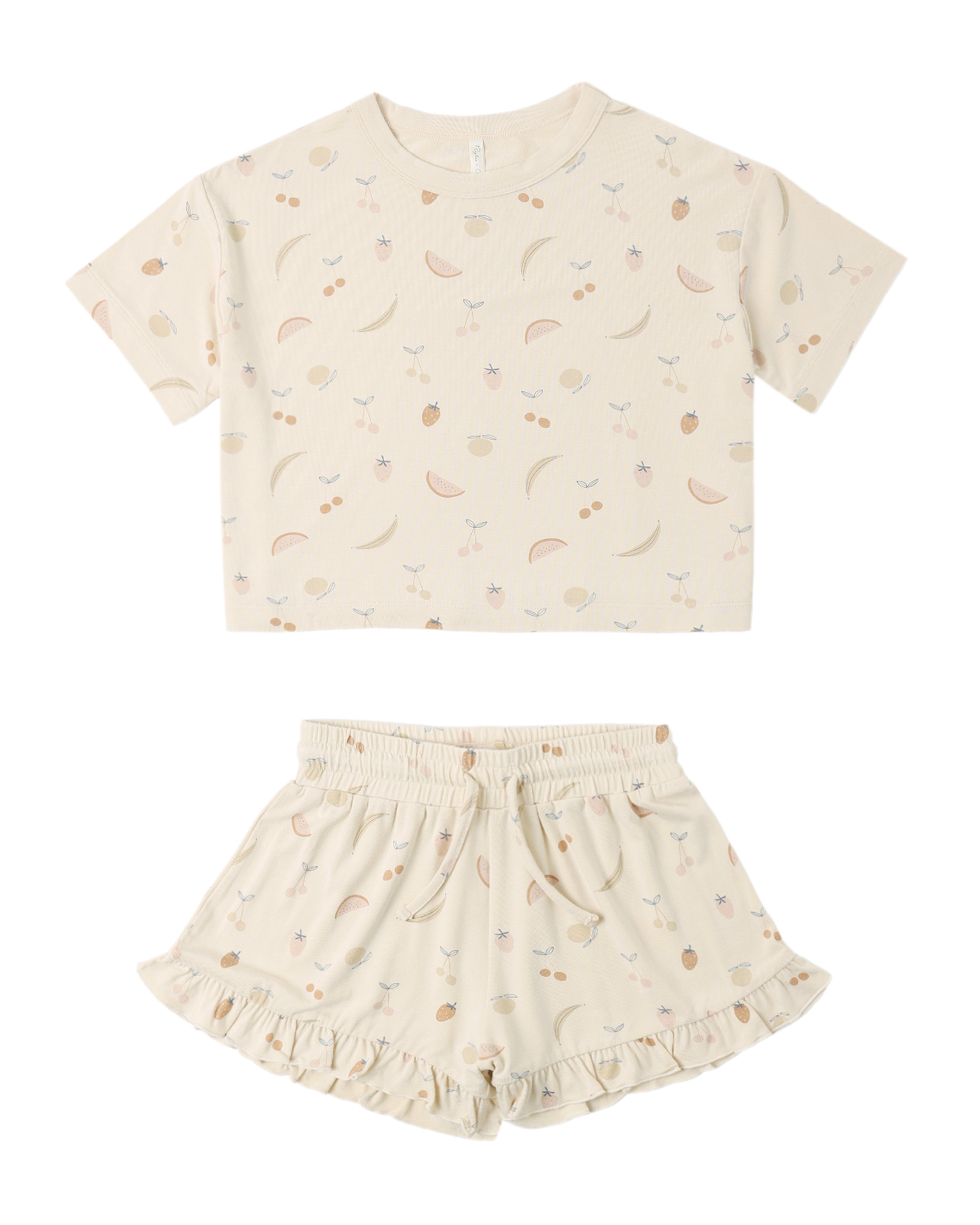 Lounge away your summer days in this cozy set - a drop shoulder top and matching shorts with ruffle detail at the hem.