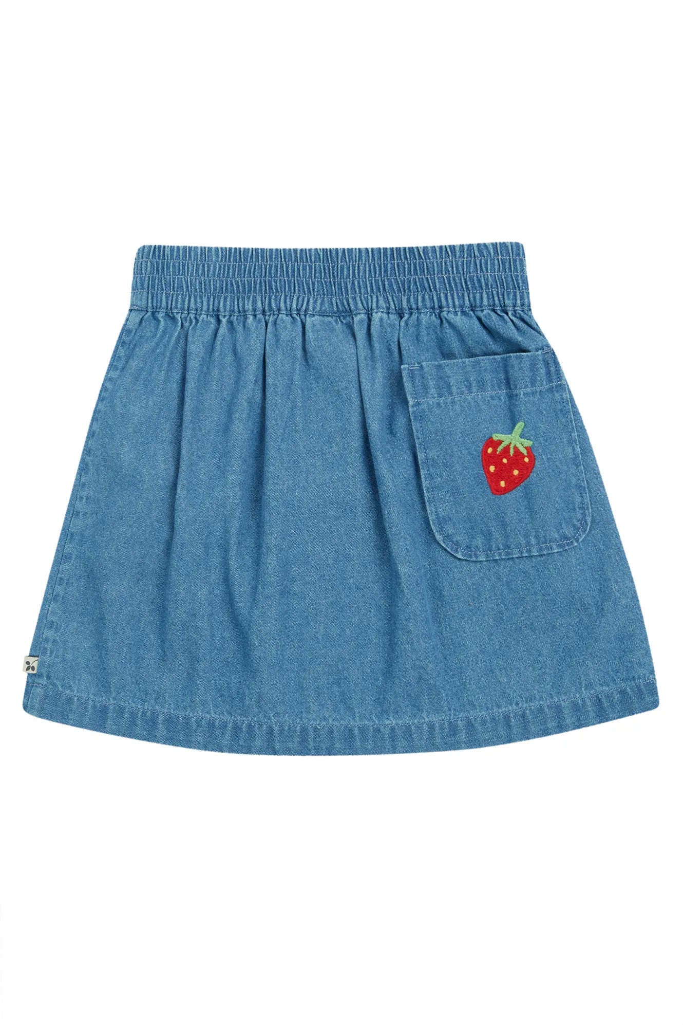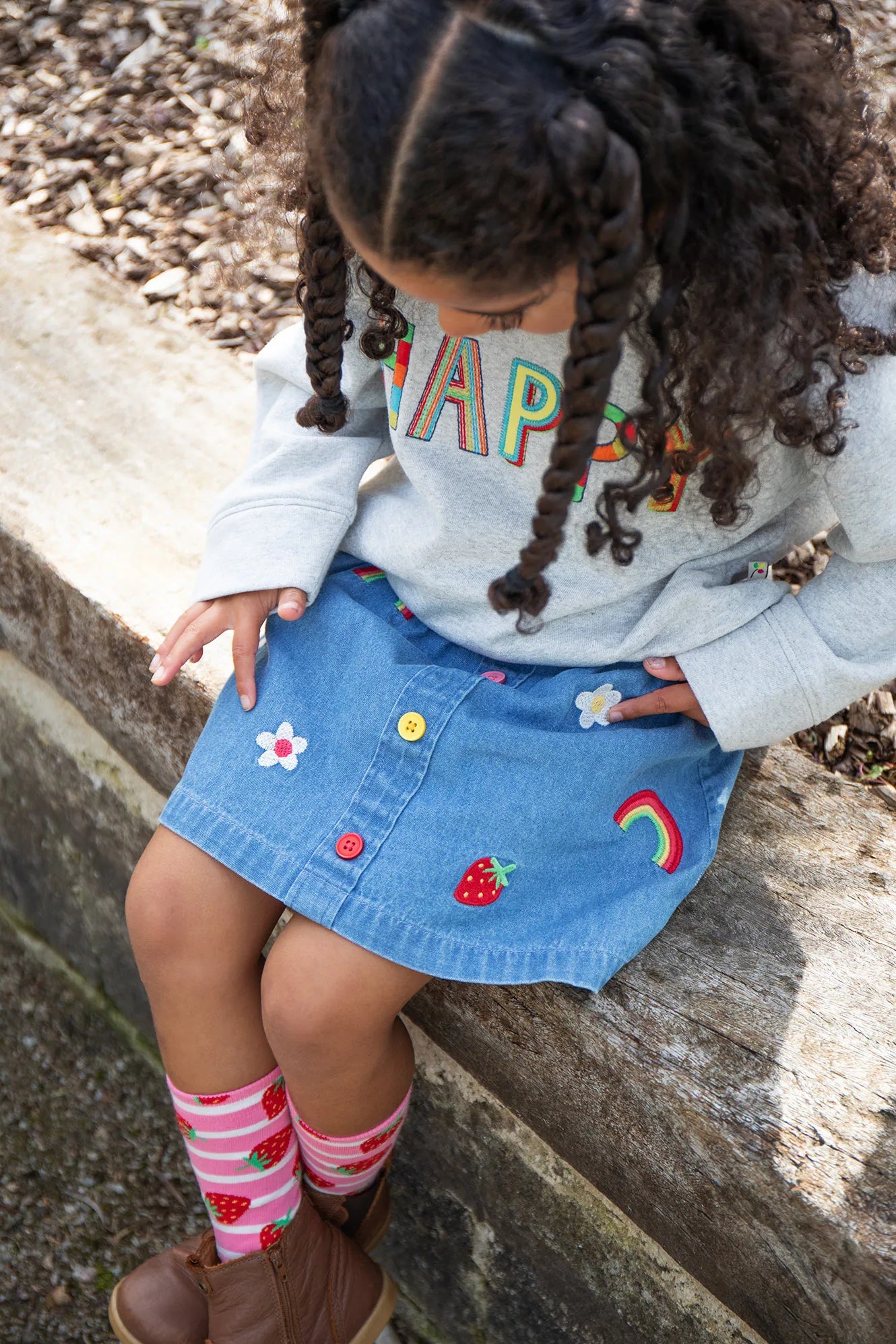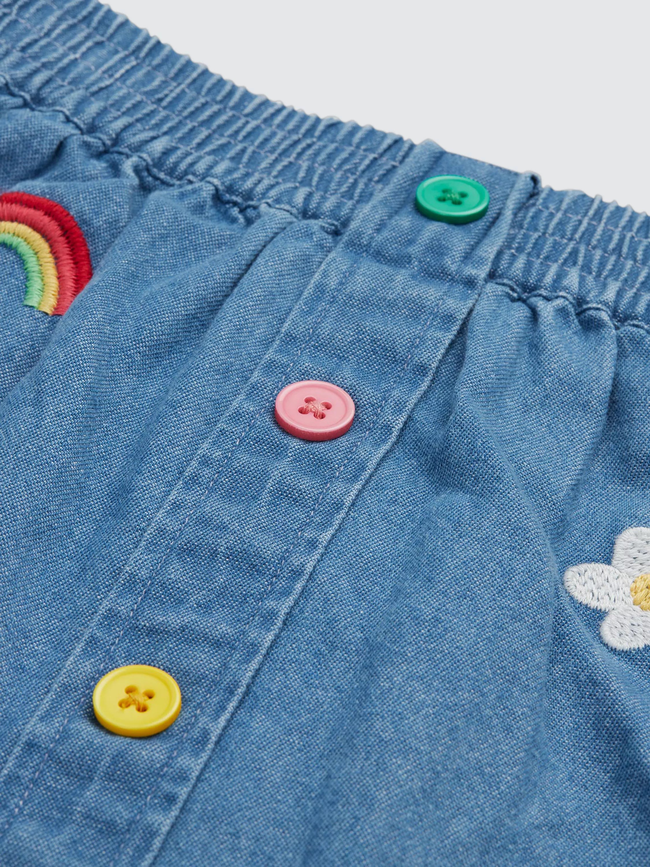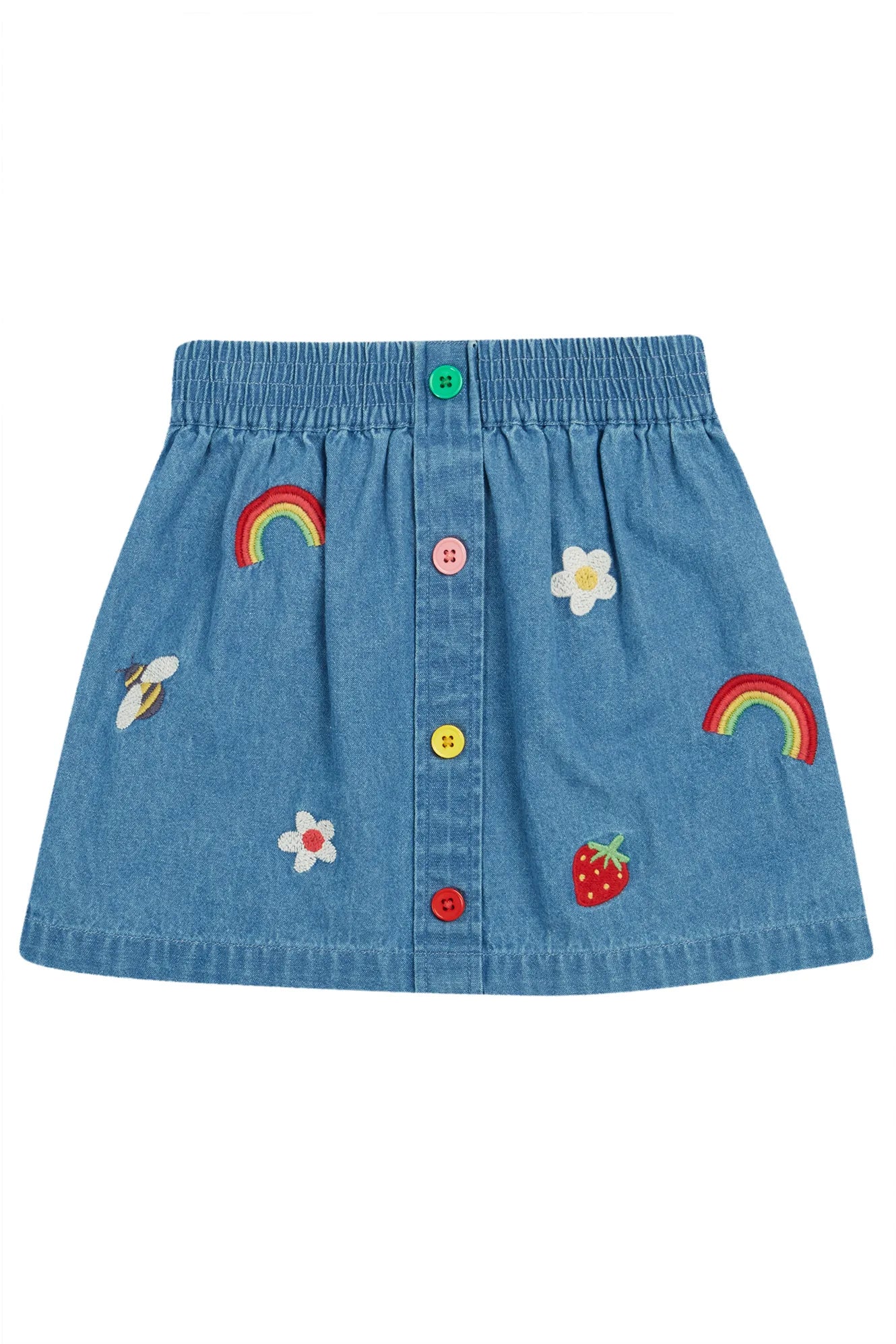 Button front fastening light-weight denim skirt with all over embroidery details.