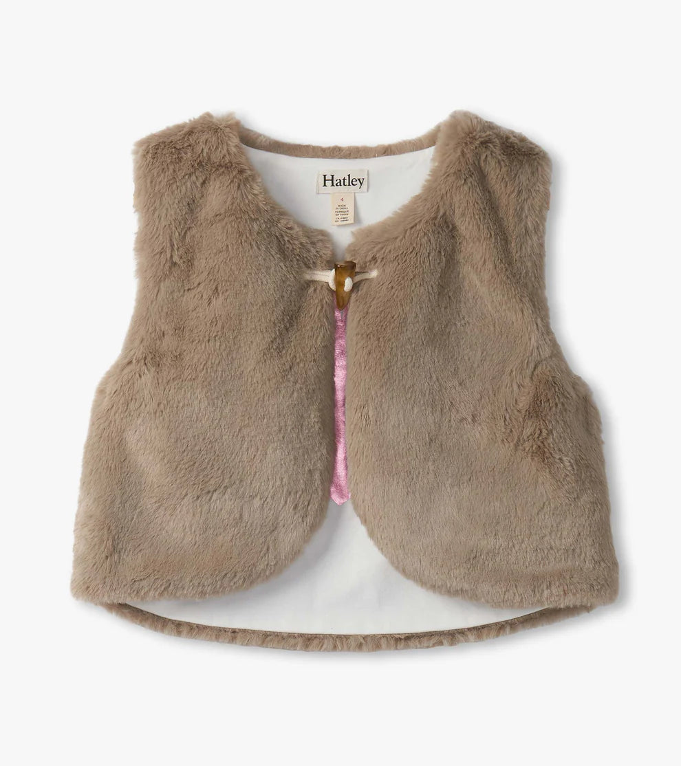 Add a layer of luxe and warmth to her look with the Girls Cropped Faux Fur Vest, a stylish piece that’s as cozy as it is charming. Featuring a plush light brown faux fur shell and a fully lined interior of smooth white jersey, this cropped vest is perfect for adding flair to any outfit. A metallic pink heart printed on the back lining adds a surprise pop of personality, while the rounded shaping and longer back hem create a flattering silhouette. The front fastens with a single toggle-style button made of faux horn for a polished finish with vintage appeal.
