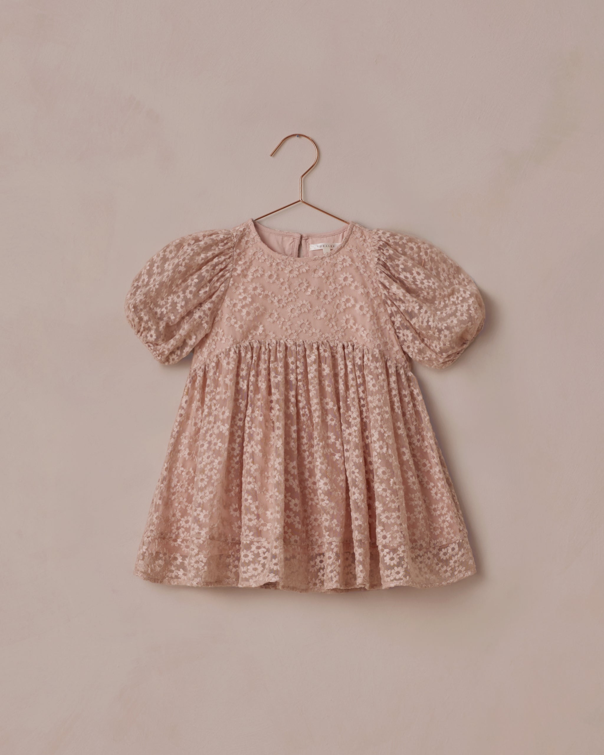 Our Luna Dress showcases a babydoll-inspired silhouette with sweet puff sleeves, a gently curved waistline, and two faux shell buttons at the back for a delicate finishing touch. Coordinating bloomers included with size 2Y.