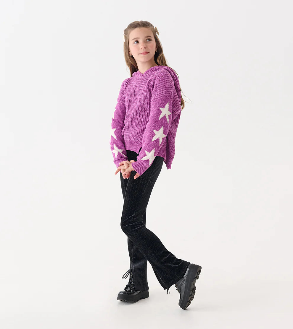 Cozy meets playful in the Girls Radiant Orchid Chenille Pullover Sweater, crafted from ultra-soft chenille yarn for a plush feel she’ll love. This relaxed-fit sweater comes in a rich purple hue with a chunky ribbed knit pattern, finished with tighter ribbing at the cuffs and hem for structure. Bold white star motifs line both sleeves, adding a fun, standout detail. The scalloped hem features small notched slits at the front and back, giving the silhouette a modern twist while ensuring ease of movement.