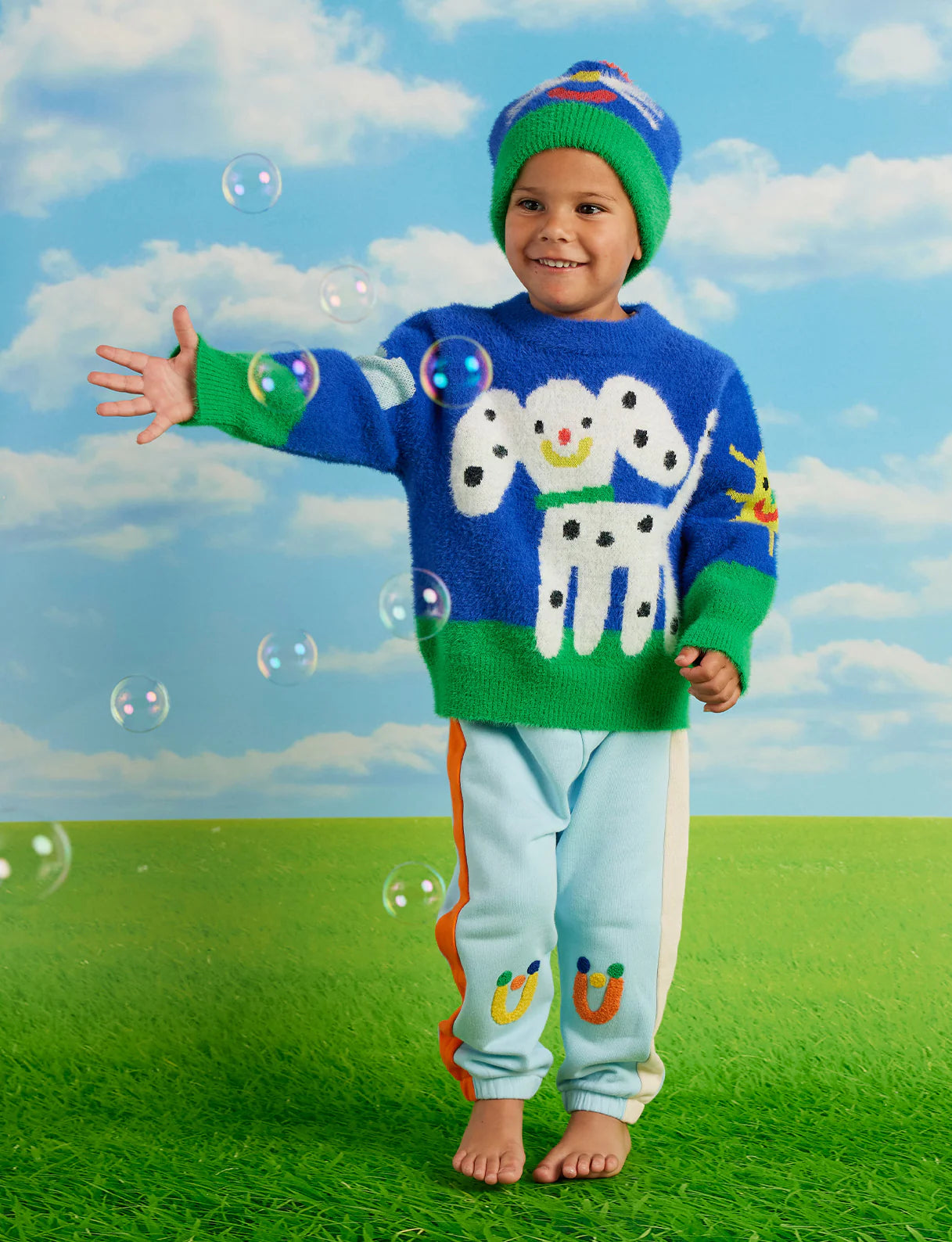 Features a crew neckline, subtle fluffy finish and picture knit design from our Puppy Park collection on both sides.