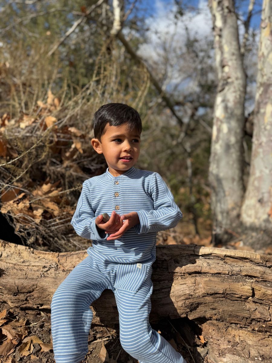 Me & Henry Mitch Henley Romper in Blue/White - is backordered and will ship as soon as it is back in stock.