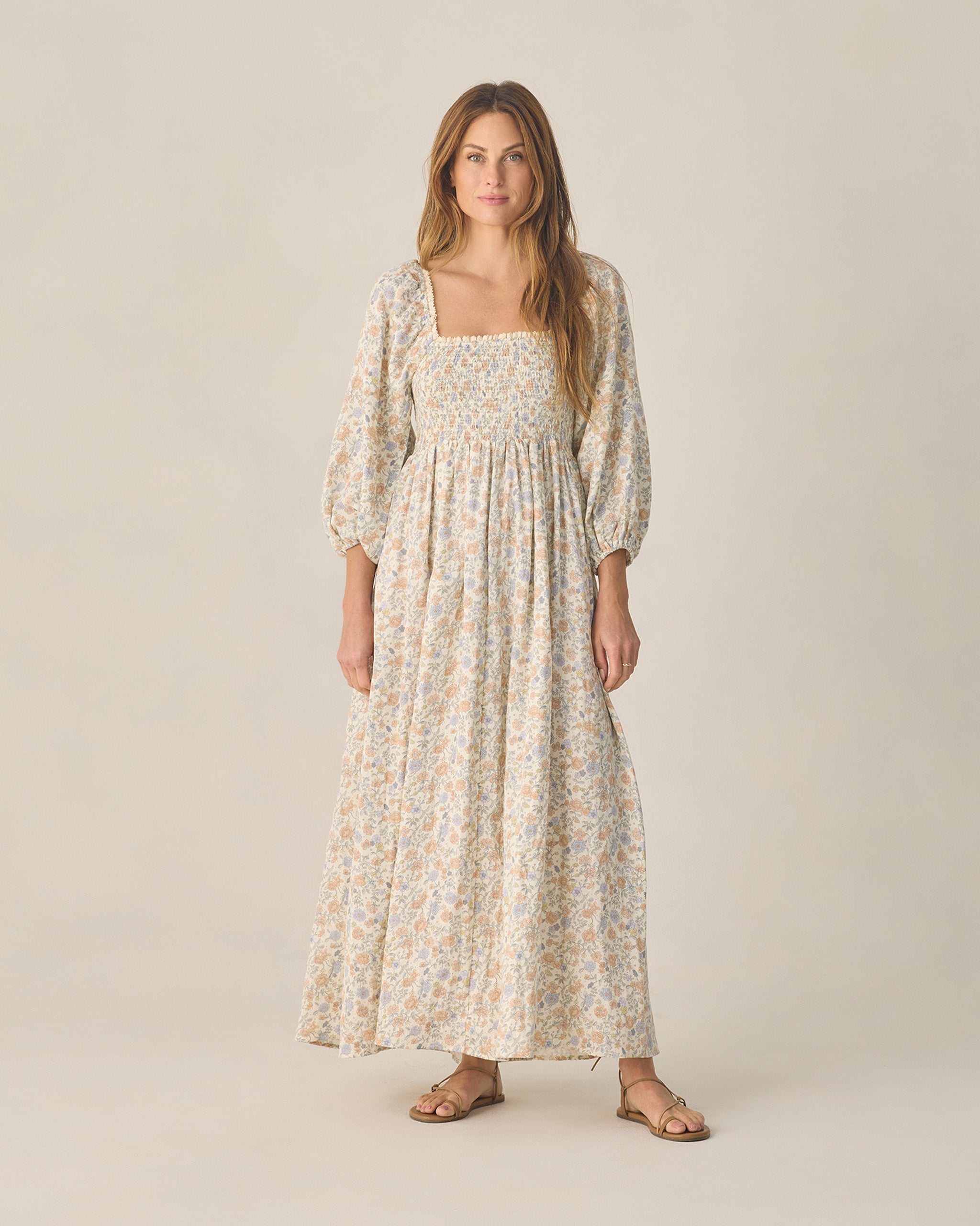 Our Della Dress dress has a smocked bodice and mid-length sleeves, with intricate crochet trim along the neck.