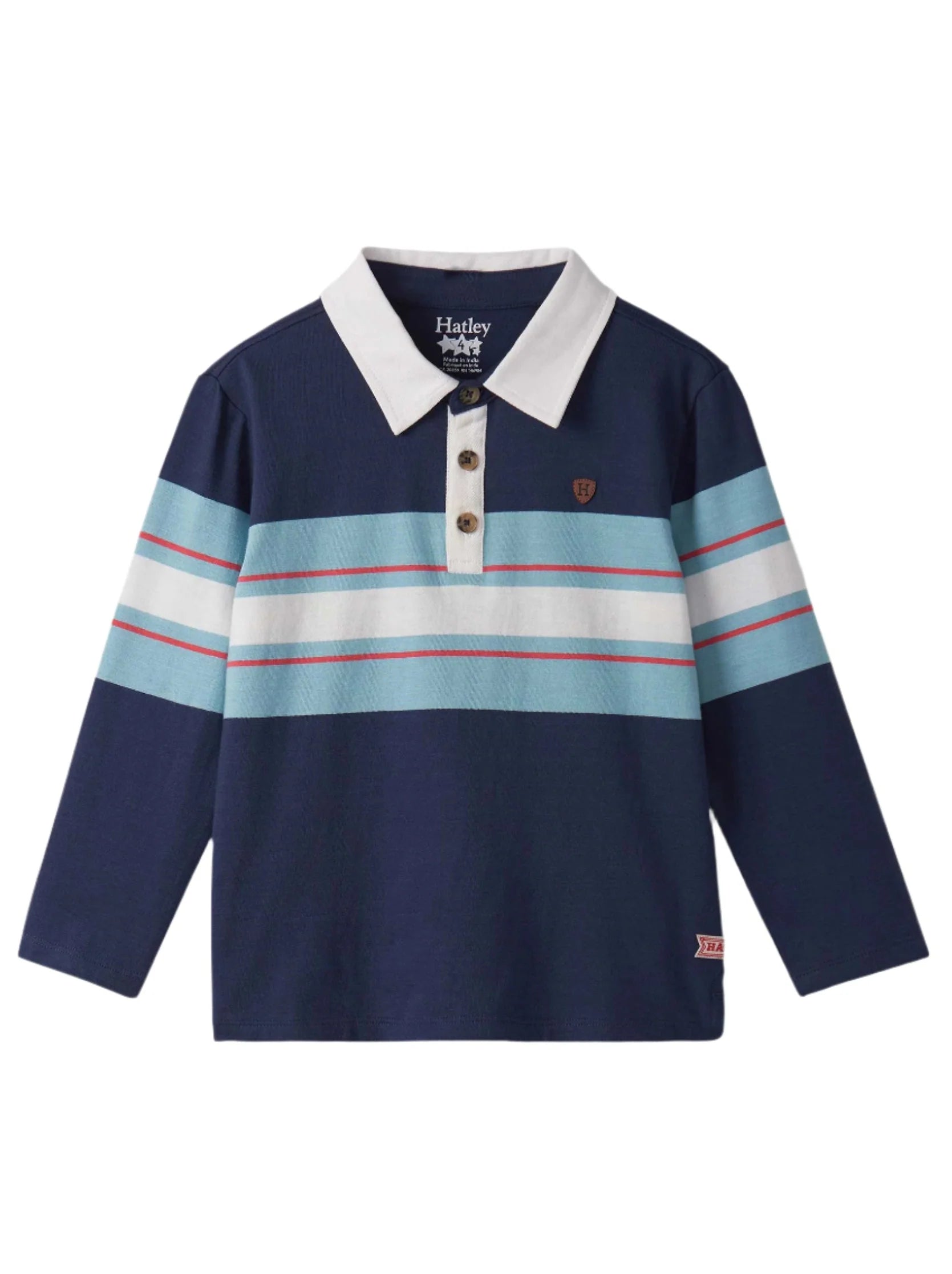 This classic rugby polo by Hatley blends comfort with style, featuring wide horizontal stripes in navy, blue, and white. A crisp white collar and soft cotton feel make it perfect for smart-casual days.