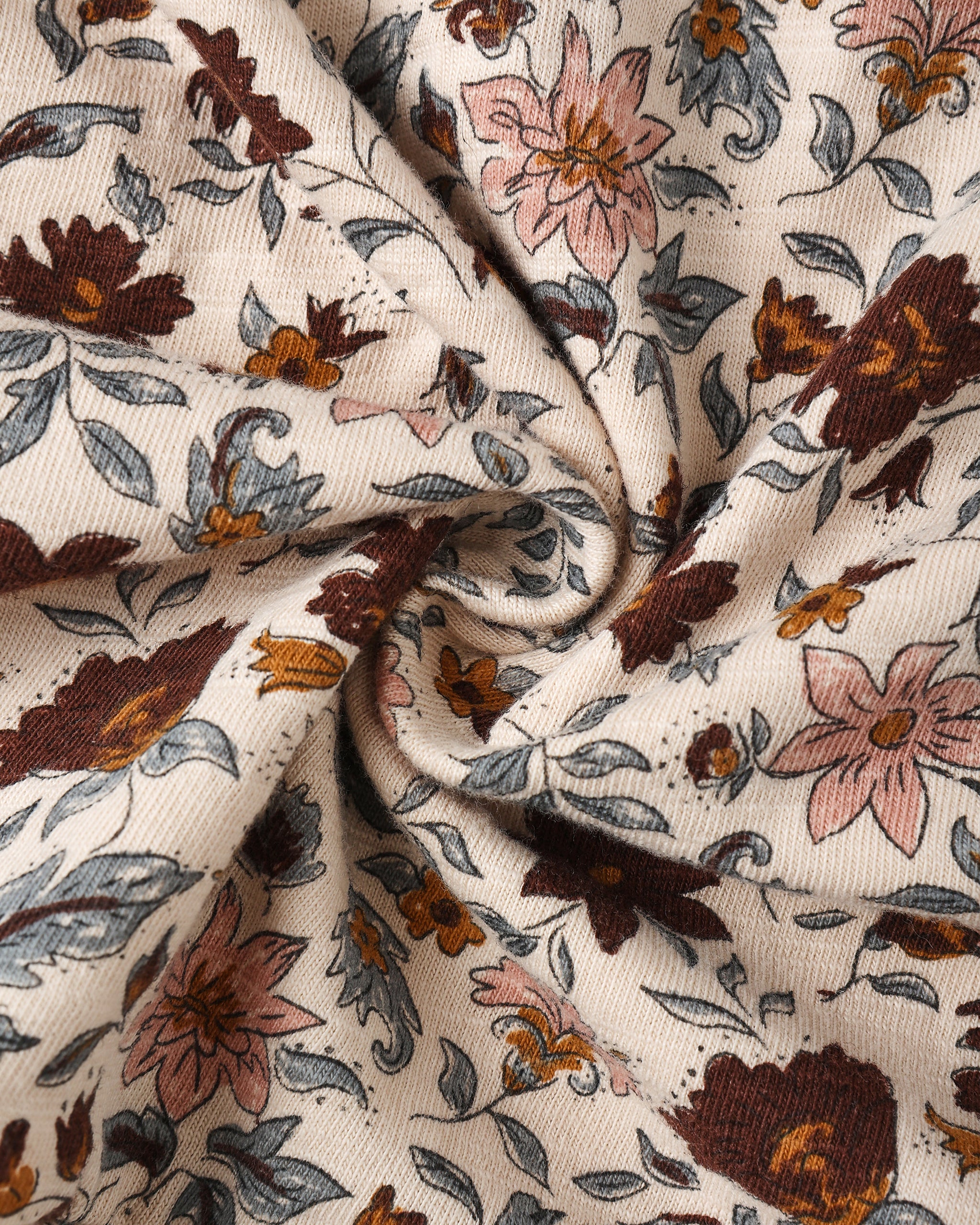 Long sleeve swing dress featuring a gathered lower tier, cinched wrists, and coconut button snaps down the front.