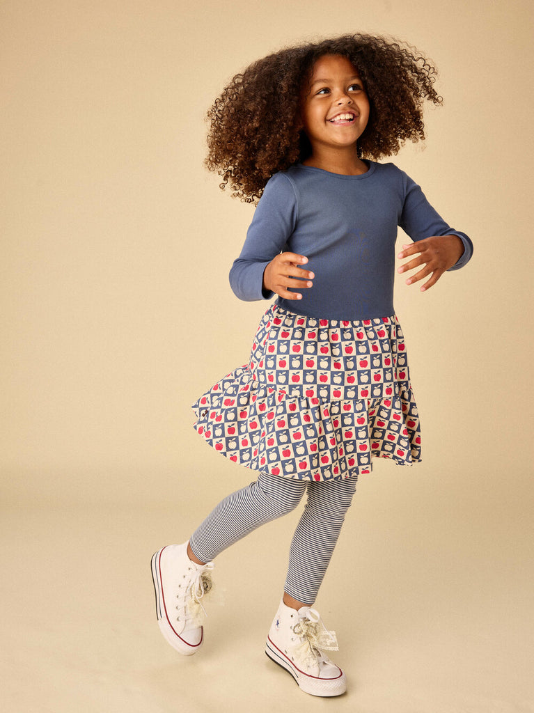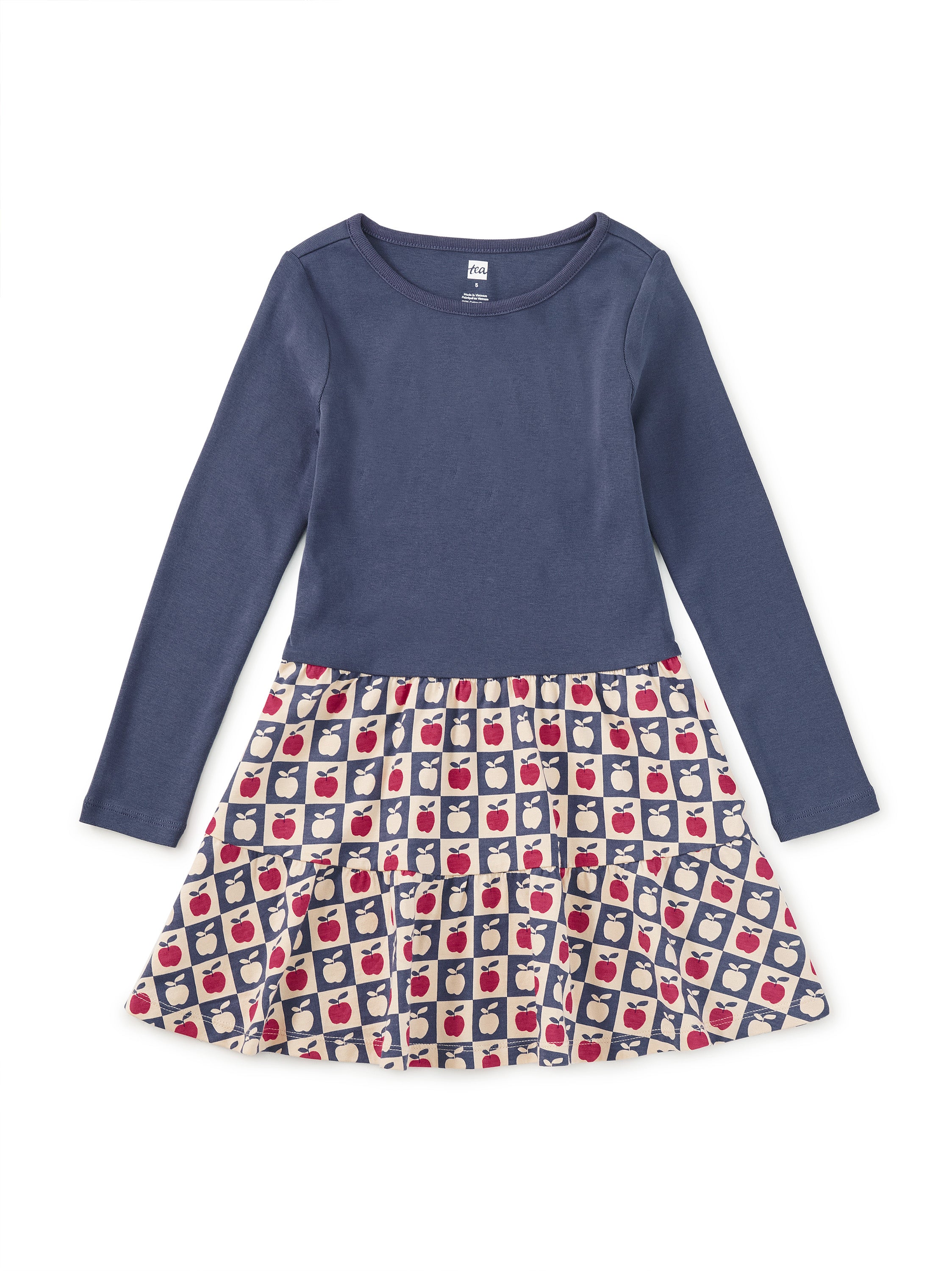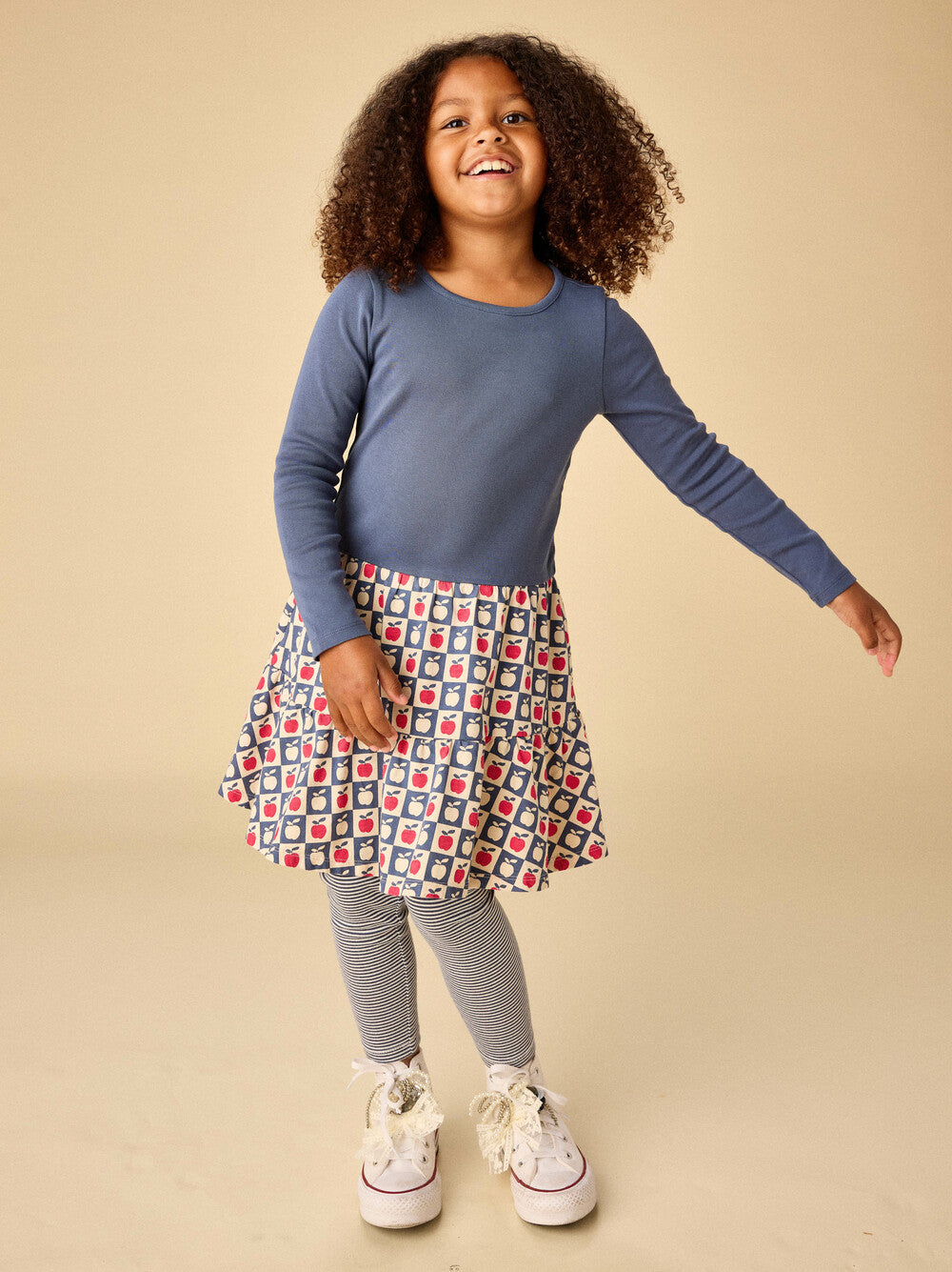 A go-to for twirl-loving kids, this dress features a fitted cotton rib bodice and a tiered cotton jersey skirt that flares with every spin. The long sleeves and crew neckline offer everyday comfort, while the below mid-thigh length ensures easy movement from classroom to playground. Designed for parents seeking a fuss-free outfit that combines comfort, durability, and playful style in one piece.