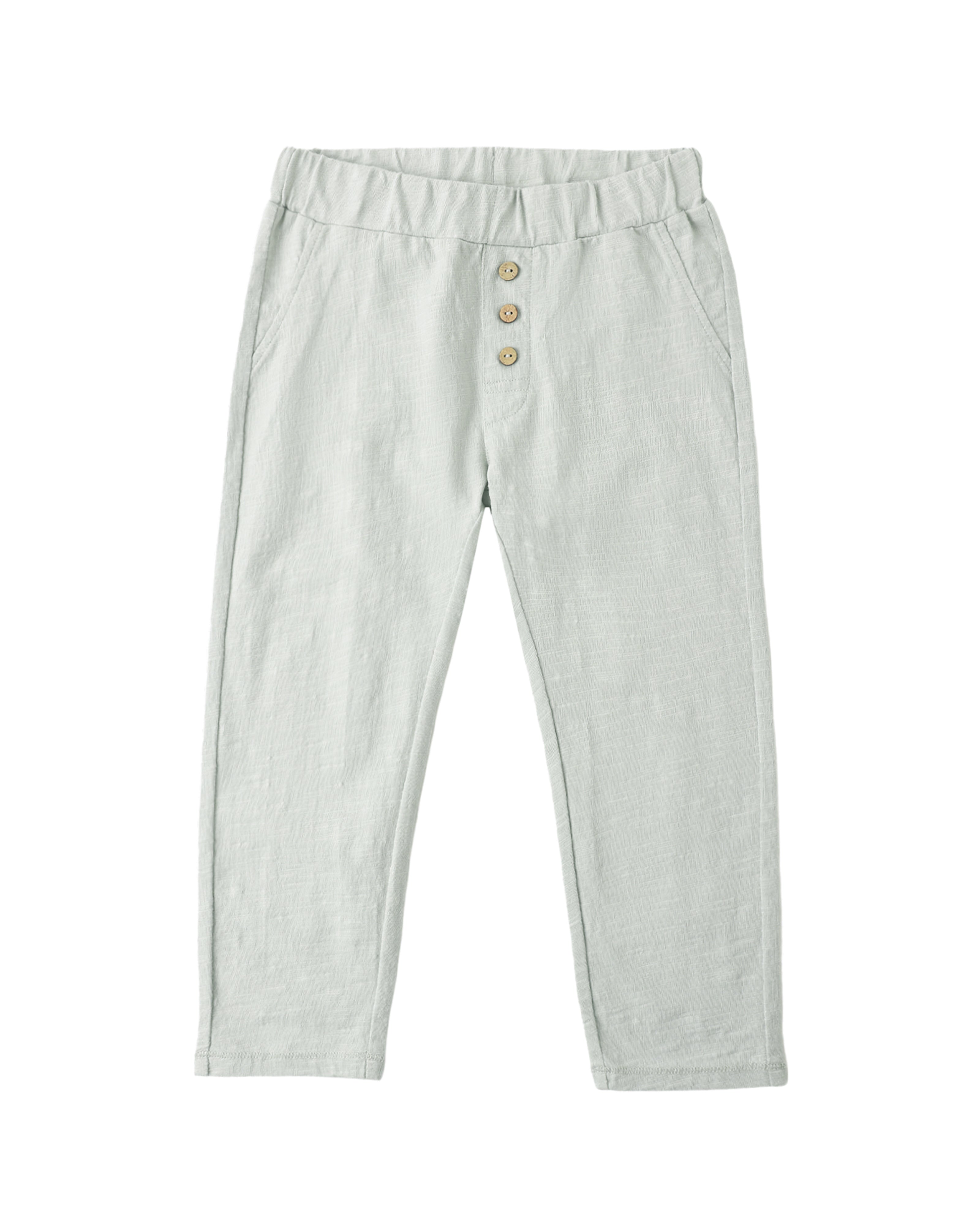 Soft cotton slub pants with coconut button detail at the front. Featuring rolled leg cuffs and an elastic waistband.