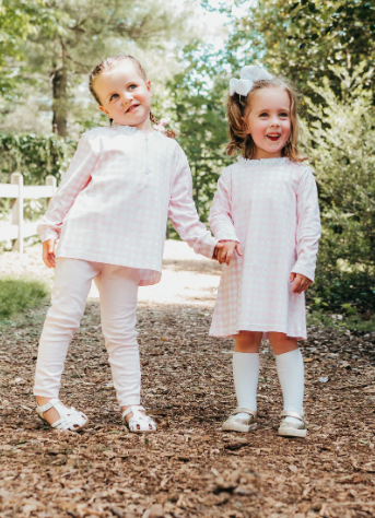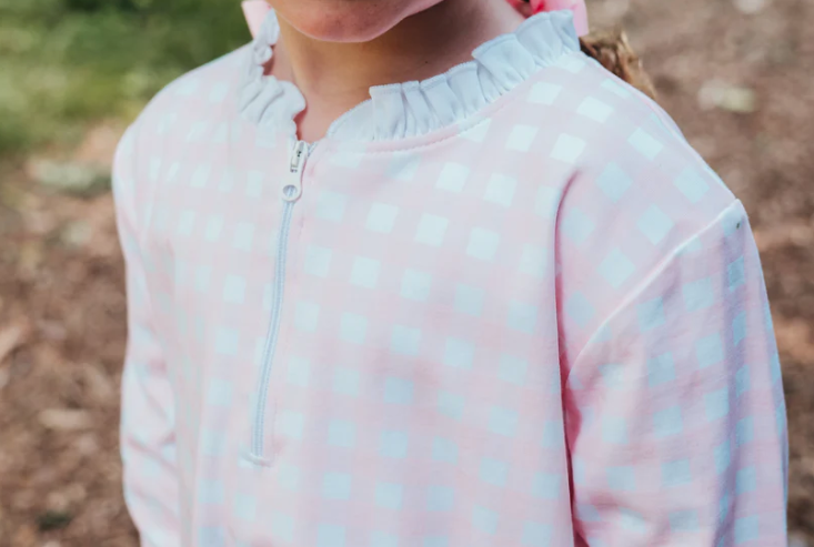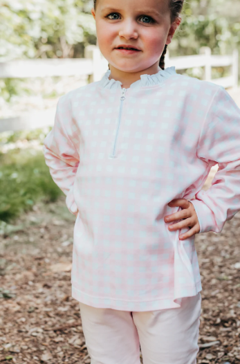 Our Lily pink buffalo check pullover will be a staple in her closet. This pullover is made from luxurious pima cotton, and ruffle collar details are the cherry on top! Fit is true to size.