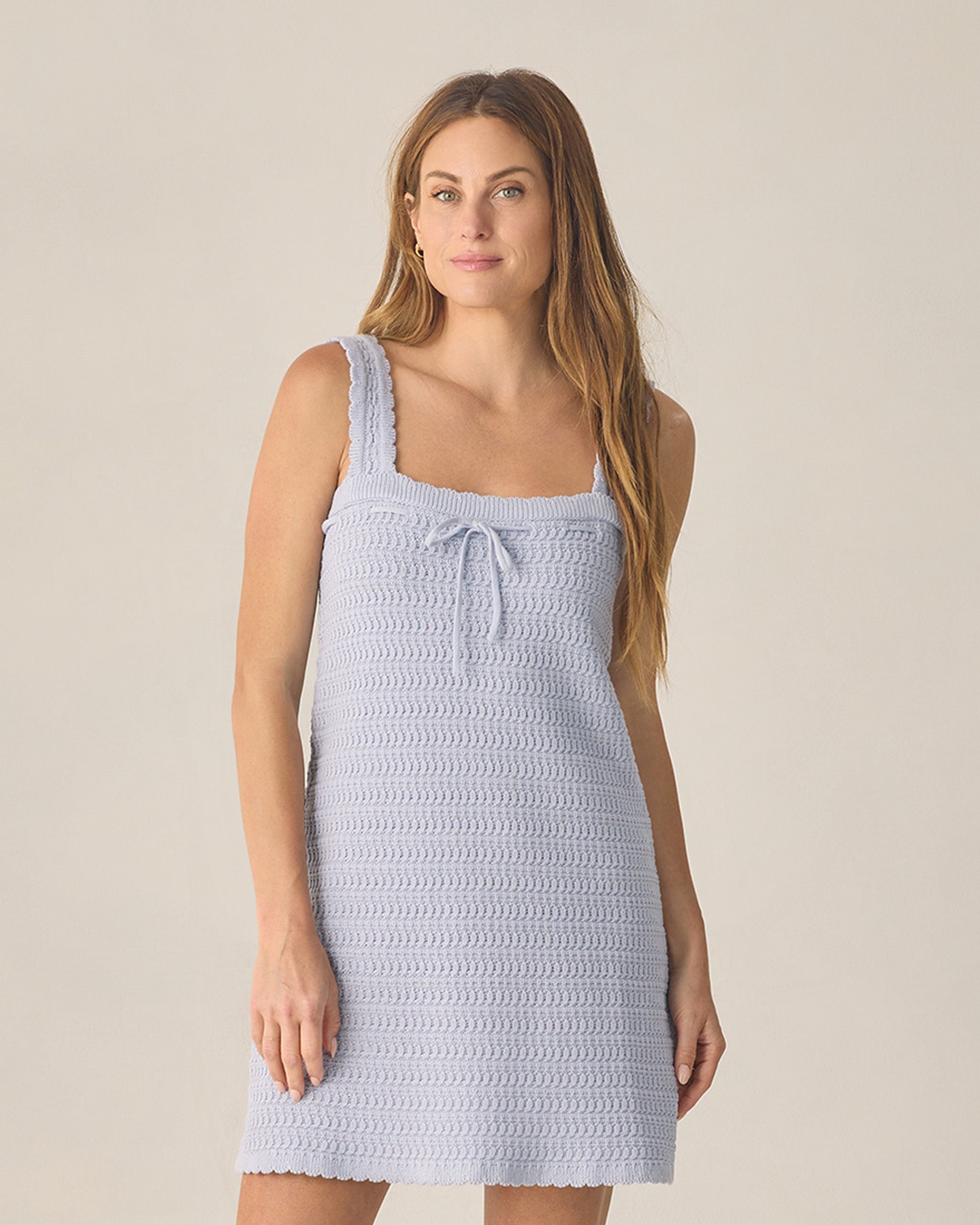 Our Crochet Mini Dress features scalloped edge detail and a front bow with a functional drawstring.