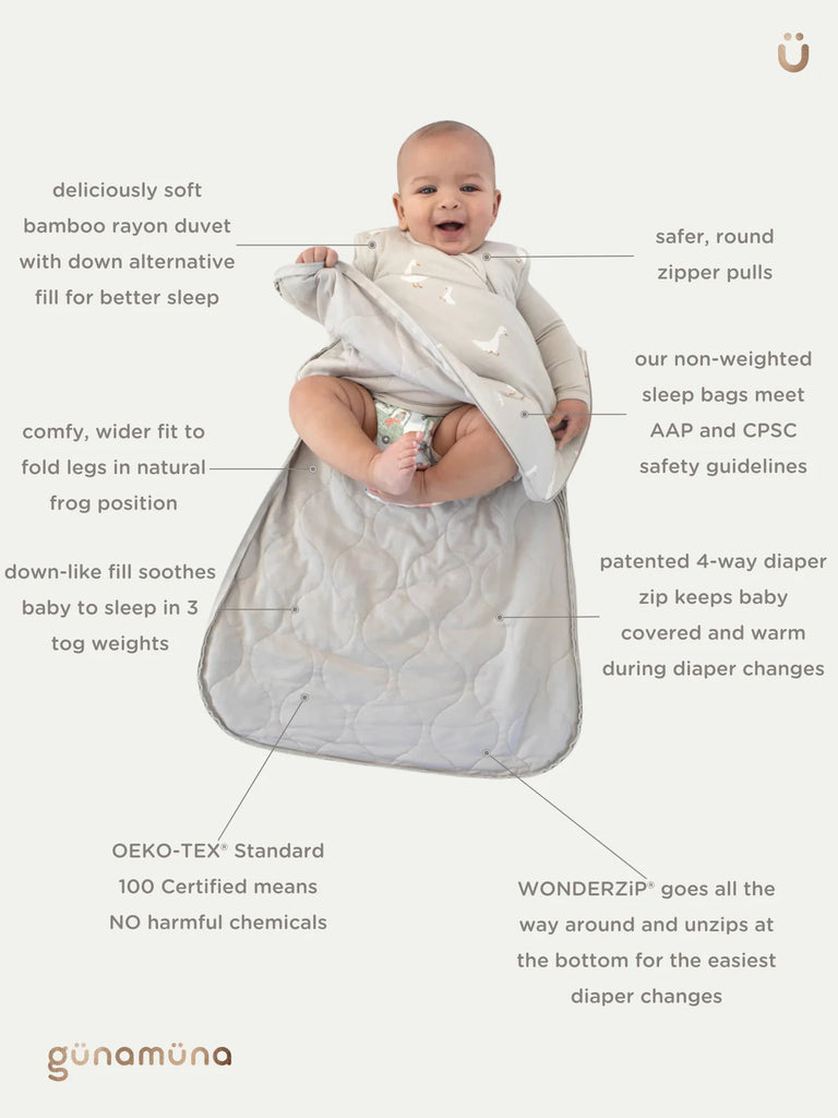 That is why we introduced the gunamuna sleep bag. A better zipper, a better fit, a better diaper change, a better fabric. The ideal sleep bag for a better night’s sleep.