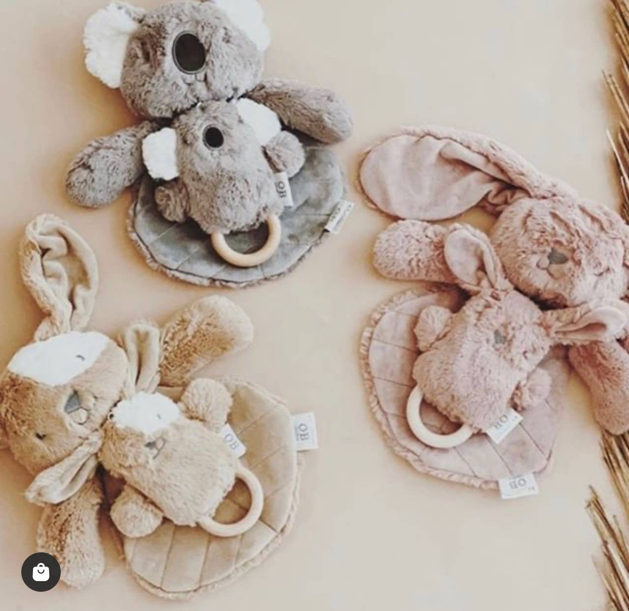 DUKE DOG'S BIO Job: Life Coach Likes: Football & SUP Boarding Designed by OB in Australia, our popular soft rattle toys are irresistibly cute and a great first toy. It helps develop motor skills and the wooden ring soothes teething pain. The soft colour palette is inspired by our home in Byron Bay and surrounds. We are passionate about design and use a combination of master craftsmen and high-quality materials to create our collection. Each toy comes with a sweet and fun bio. Perfect for gifting and a wonderful keepsake. DETAILS AND SPECIFICATIONS: Suitable for Ages 3m+ Toy 6.8 inches long Made by a Sedex audited Manufacturer Interior of toys are recycled material 100% Polyester interior and exterior Our wooden teething rings are ethically made using sustainably sourced wood and come in compostable polybags.