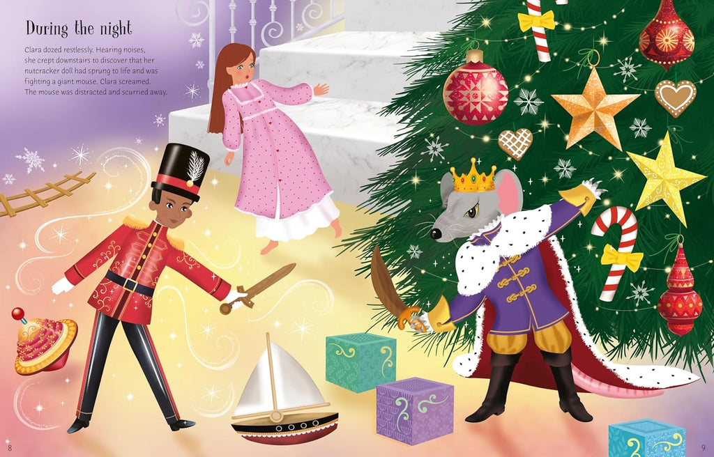 Use the stickers to dress the doll characters in this exciting version of the The Nutcracker ballet. Clara's uncle gives her a wooden nutcracker doll for Christmas, which, after a battle with the evil Mouse King, transforms into a real-life prince. Clara and the prince travel through a forest, filled with twirling snowflakes, before arriving the kingdom of the Sugar Plum Fairy, where trees are made of candy floss, cupcakes and candy canes. Clara eventually returns home. Has her experience been real or is it all an amazing dream?