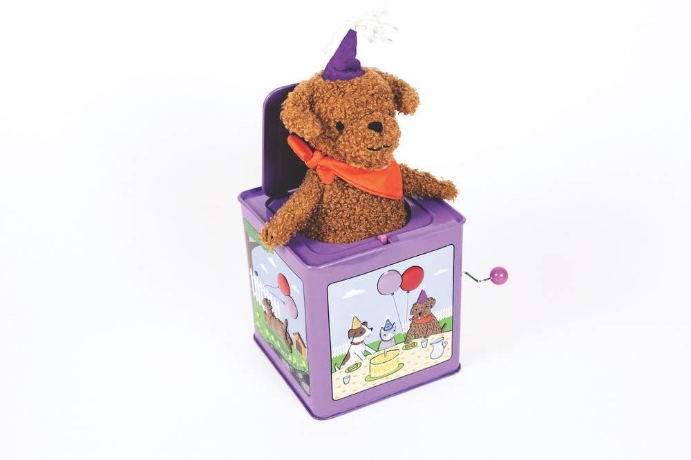 Jack-in-the-Boxes have been a time-honored favorite toy since the 1500’s! Jack Rabbit Creations creates a twist on this classic, with all original art, cuddly plush characters, and unique play-along songs. Surprise your youngsters with this Birthday Puppy Jack in the Box that plays “Happy Birthday”.