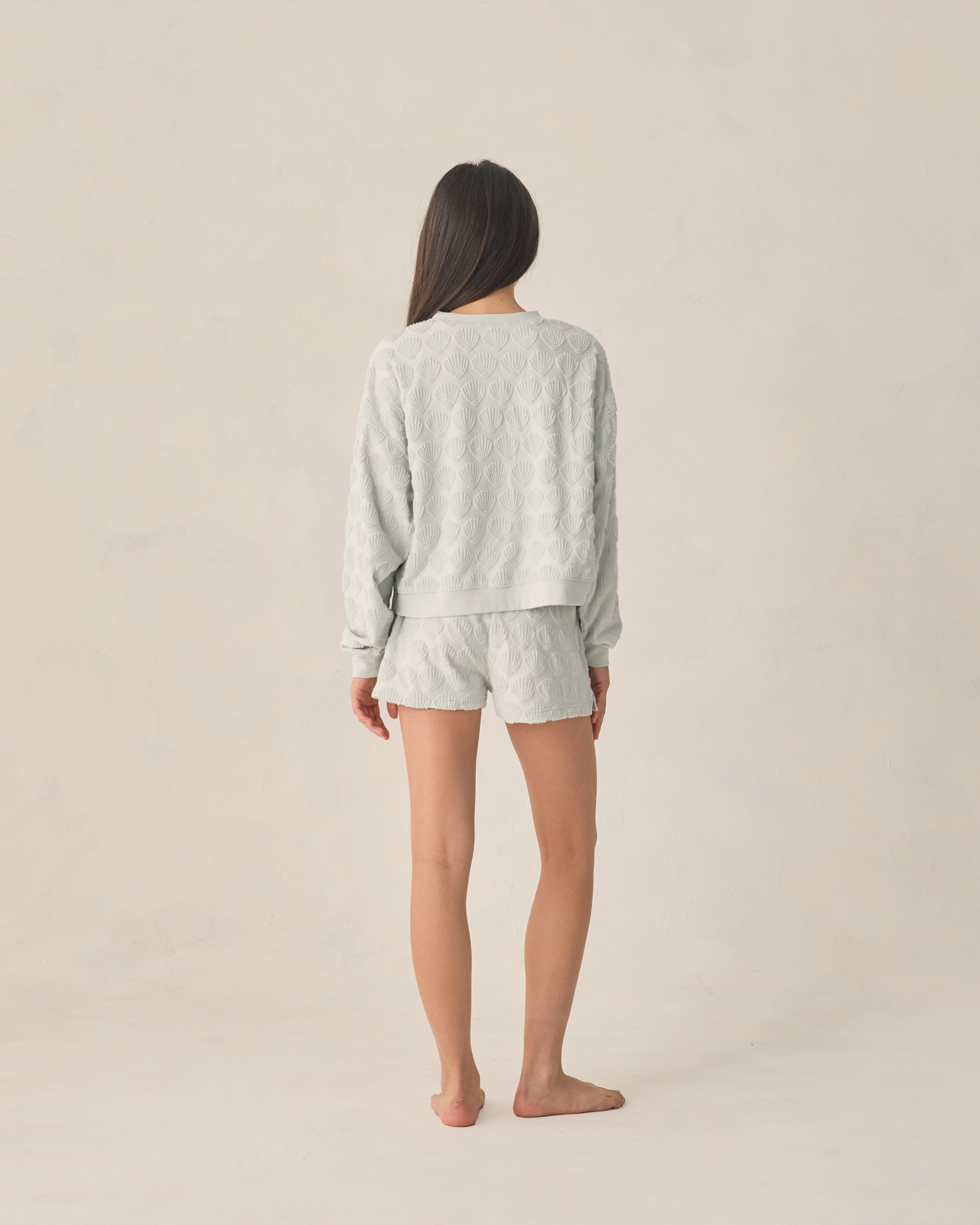Featuring our ‘seashell terry’ print on our ‘seafoam’ hue. This minimalistic look is ready for summer!