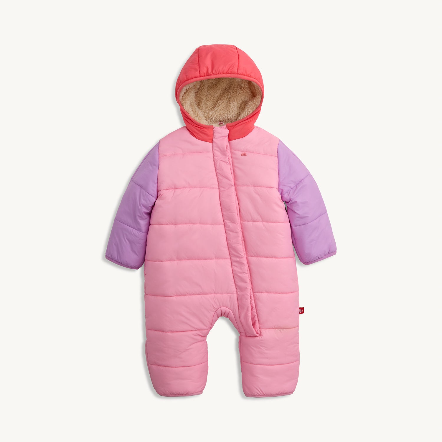 Our Puffer Pram features magnetic closures, allowing you to nestle your baby quickly and quietly into full-coverage warmth on frosty days. There's room for layering inside, while a sherpa hood, fleece lining, a high collar that acts as a barrier against wind, and wind-resistant cuffs help baby feel cozy in the cold.