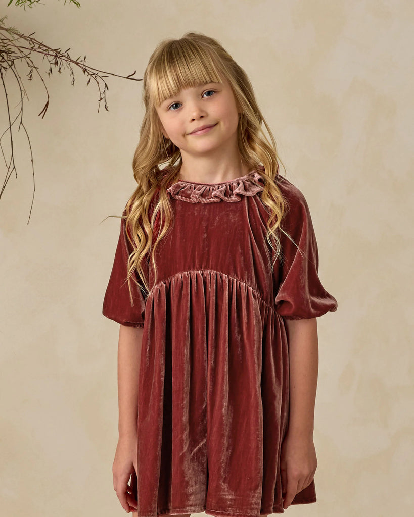 This sophisticated velvet dress features a sweet ruffle collar and voluminous balloon sleeves, complete with a zipper back closure. Coordinating bloomers included with size 12M-2Y.