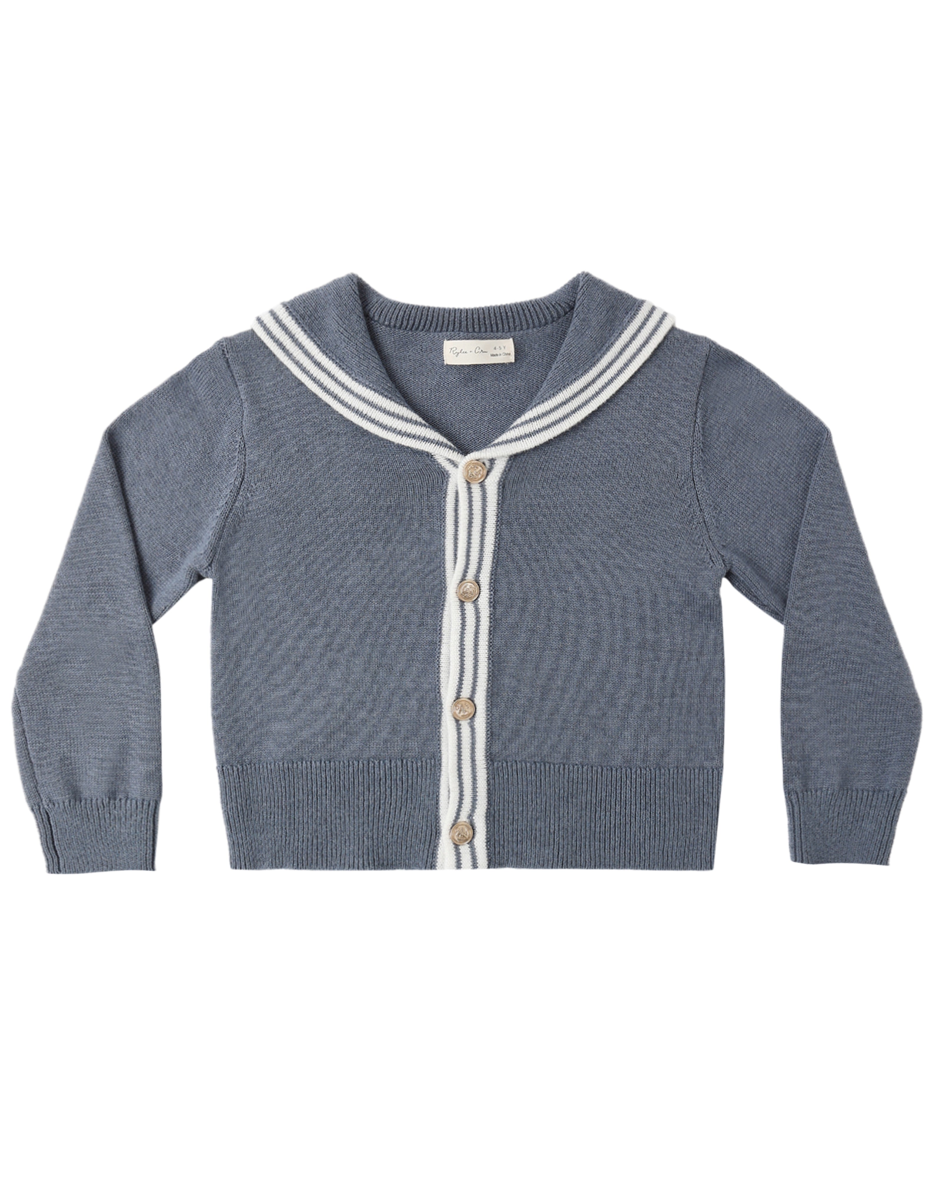 Our Sailor Cardigan features a jersey stitch body with rib cuffs, antique brass buttons and an over-sized collar.